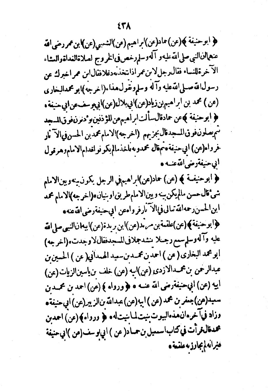 (أبو حنيفة) (عن) حماد (عن) إبراهيم (عن) الشعبي (عن) ابن عمر رضي الله عنهما أن النبي صلى الله عليه وآله وسلم رخص في الخروج لصلاة الغداة والعشاء الآخرة للنساء فقال رجل لابن عمر إذاً يتخذنه دغلاً فقال ابن عمر أخبرك عن رسول الله صلى الله عليه وآله وسلم وتقول هذا* (أخرجه) أبو محمد البخاري (عن) محمد بن إبراهيم بن زياد (عن) أبي بلال (عن) أبي يوسف عن أبي حنيفة*