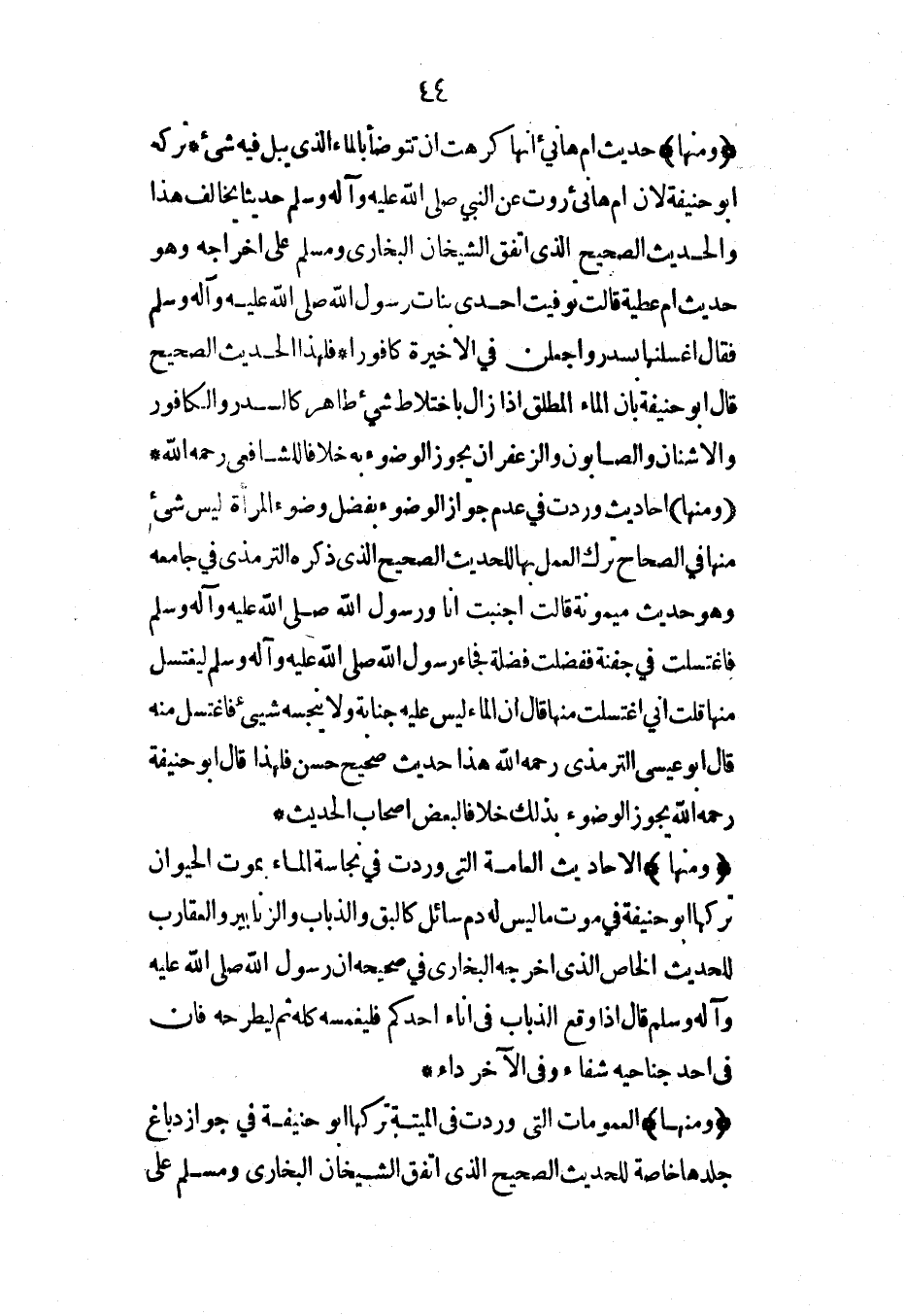(ومنها) حديث أم هانئ أنها كرهت أن تتوضأ بالماء الذي يبل فيه شيء* تركه أبو حنيفة لأن أم هانئ روت عن النبي صلى الله عليه وآله وسلم حديثاً يخالف هذا والحديث الصحيح الذي اتفق الشيخان البخاري ومسلم على إخراجه وهو حديث أم عطية قالت توفيت إحدى بنات رسول الله صلى الله عليه وآله وسلم فقال اغسلنها بسدر واجعلن في الأخيرة كافوراً* فلهذا الحديث الصحيح قال أبو حنيفة بأن الماء المطلق إذا زال باختلاط شيء طاهر كالسدر والكافور والأشنان والصابون والزعفران يجوز الوضوء به خلافاً للشافعي رحمه الله* (ومنها) أحاديث وردت في عدم جواز الوضوء بفضل وضوء المرأة ليس شيء منها في الصحاح ترك العمل بها للحديث الصحيح الذي ذكره الترمذي في جامعه وهو حديث ميمونة قالت أجنبت أنا ورسول الله صلى الله عليه وآله وسلم فاغتسلت في جفنة ففضلت فضلة فجاء رسول الله صلى الله عليه وآله وسلم ليغتسل منها قلت إني اغتسلت منها قال إن الماء ليس عليه جنابة ولا ينجسه شيء فاغتسل منه قال أبو عيسى الترمذي رحمه الله هذا حديث صحيح حسن فلهذا قال أبو حنيفة رحمه الله يجوز الوضوء بذلك خلافاً لبعض أصحاب الحديث*
