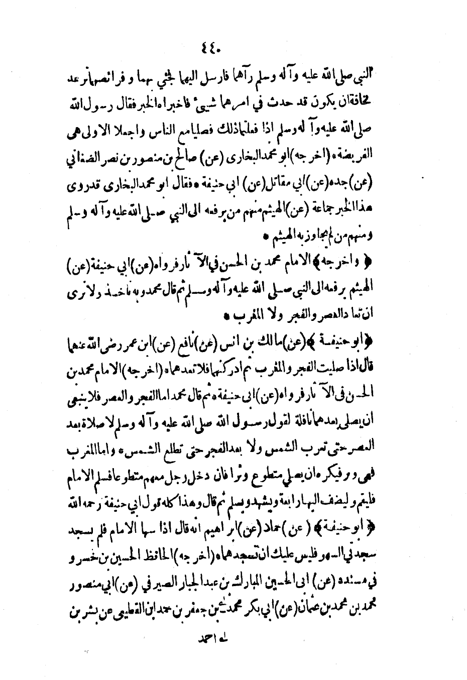 (أبو حنيفة) (عن) مالك بن أنس (عن) نافع (عن) ابن عمر رضي الله عنهما قال إذا صليت الفجر والمغرب ثم أدركتهما فلا تعدهما* (أخرجه) الإمام محمد بن الحسن في الآثار فرواه (عن) أبي حنيفة* ثم قال محمد أما الفجر والعصر فلا ينبغي أن يصلي بعدهما نافلة لقول رسول الله صلى الله عليه وآله وسلم لا صلاة بعد العصر حتى تغرب الشمس ولا بعد الفجر حتى تطلع الشمس* وأما المغرب فهي وتر فيكره أن يصلي متطوع وتراً فإن دخل رجل معهم متطوعاً فسلم الإمام فليقم وليضف إليها رابعة ويشهد ويسلم ثم قال وهذا كله قول أبي حنيفة رحمه الله (أبو حنيفة) (عن) حماد (عن) إبراهيم أنه قال إذا سها الإمام فلم يسجد سجدتي في السهو فليس عليك أن تسجدهما* (أخرجه) الحافظ الحسين بن خسرو في مسنده (عن) أبي الحسين المبارك بن عبد الجبار الصيرفي (عن) أبي منصور محمد بن محمد بن عثمان (عن) أبي بكر محمد بن جعفر بن محمد ابن القطيعي عن بشر بن