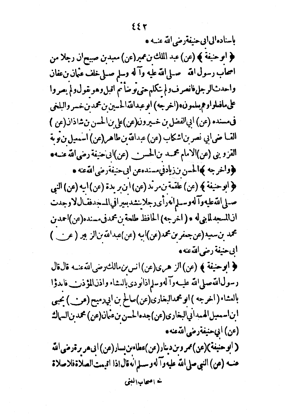 (أبو حنيفة) (عن) عبد الملك بن عمير (عن) معبد بن صبيح أن رجلاً من أصحاب رسول الله صلى الله عليه وآله وسلم صلى خلف عثمان بن عفان وأحدث الرجل فانصرف ولم يتكلم حتى توضأ ثم أقبل وهو يقول {ولم يصروا على ما فعلوا وهم يعلمون} * (أخرجه) أبو عبد الله الحسين بن محمد بن خسرو البلخي في مسنده (عن) أبي الفضل بن خيرون (عن) علي بن الحسن بن شاذان (عن) القاضي أبي نصر بن اشكاب (عن) عبد الله بن طاهر (عن) إسماعيل بن توبة القزويني (عن) الإمام محمد بن الحسن (عن) أبي حنيفة رضي الله عنه* (وأخرجه) الحسن بن زياد في مسنده عن أبي حنيفة رضي الله عنه*