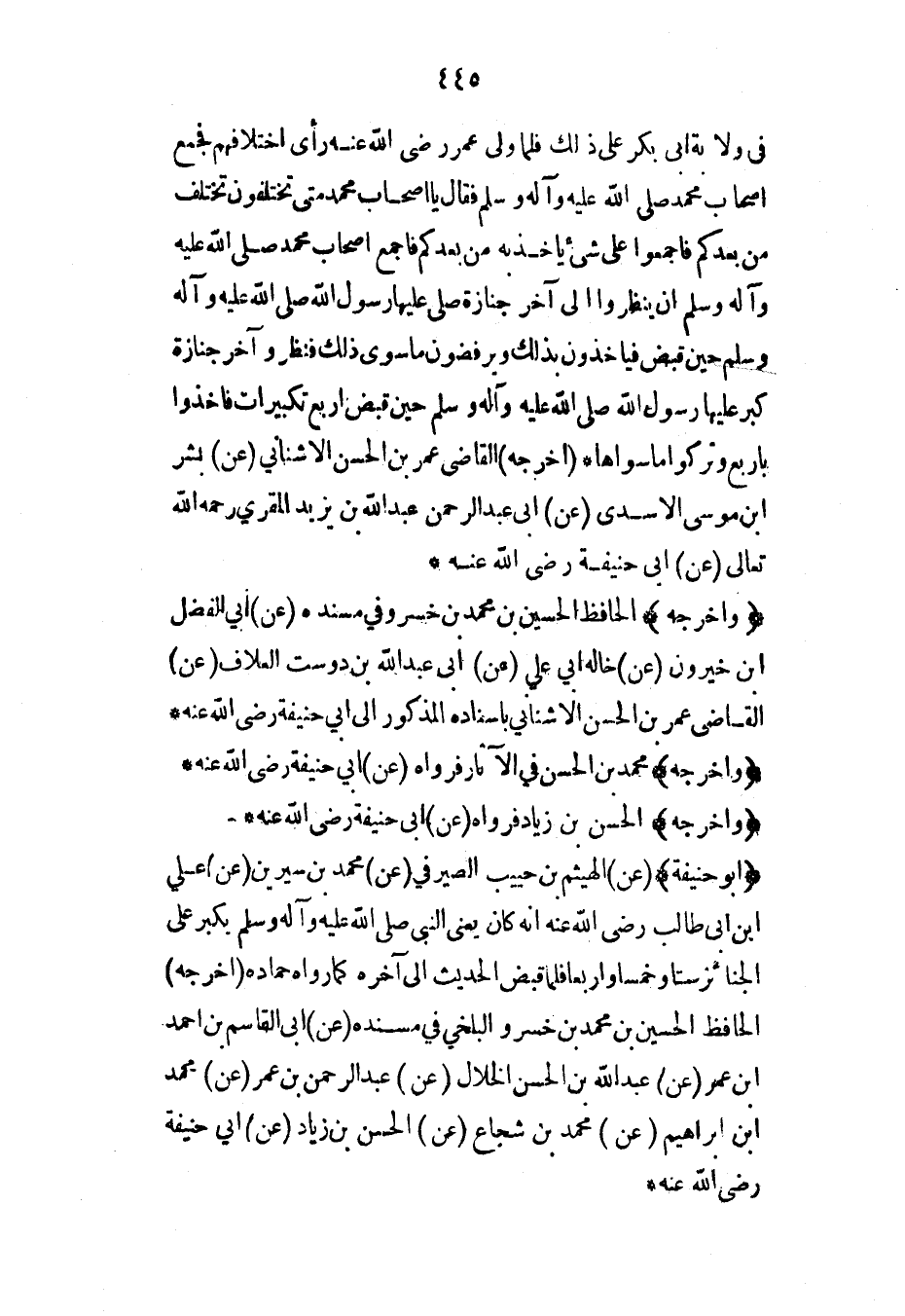 (أبو حنيفة) (عن) الهيثم بن حبيب الصيرفي (عن) محمد بن سيرين (عن) علي ابن أبي طالب رضي الله عنه أنه كان يعني النبي صلى الله عليه وآله وسلم يكبر على الجنائز ستاً وخمساً وأربعاً فلما قبض الحديث إلى آخره كما رواه حماد* (أخرجه) الحافظ الحسين بن محمد بن خسرو البلخي في مسنده (عن) أبي القاسم بن أحمد ابن عمر (عن) عبد الله بن الحسن الخلال (عن) عبد الرحمن بن عمر (عن) محمد ابن إبراهيم (عن) محمد بن شجاع (عن) الحسن بن زياد (عن) أبي حنيفة رضي الله عنه*