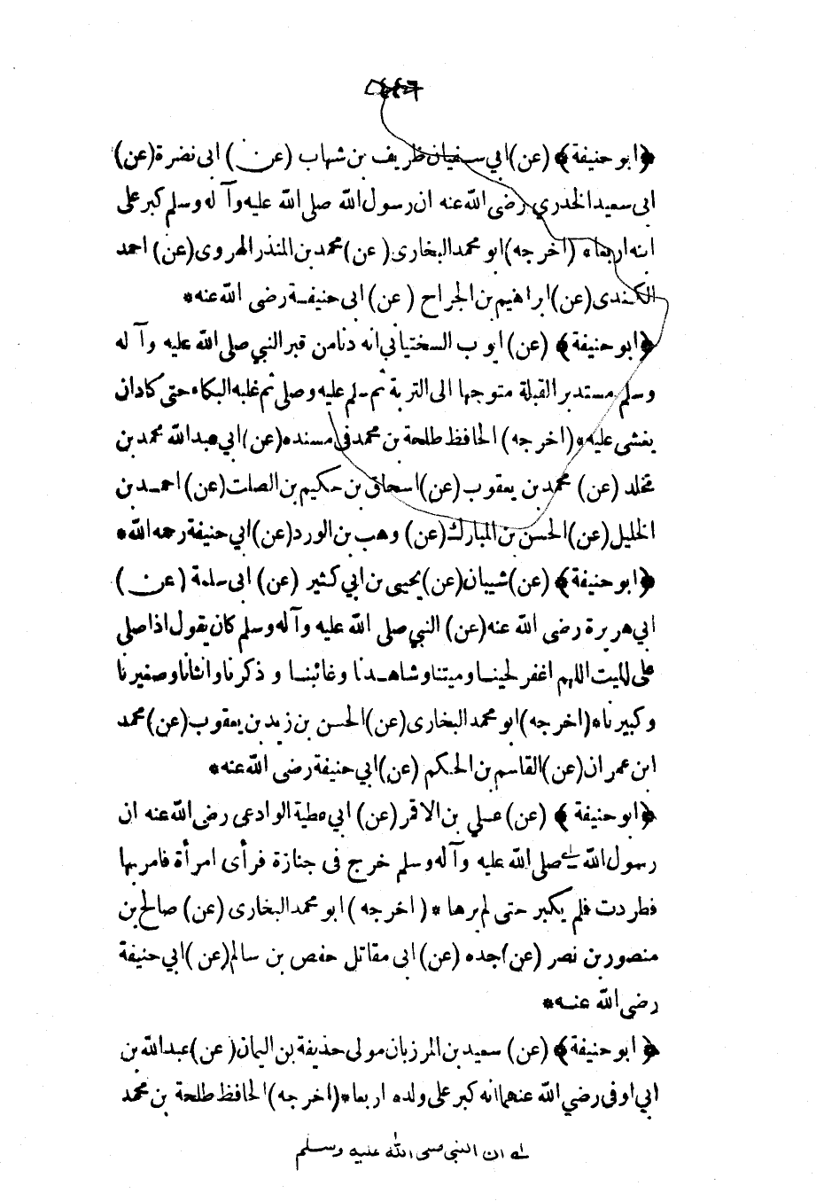 (أبو حنيفة) (عن) أبي سفيان ظريف بن شهاب (عن) أبي نضرة (عن) أبي سعيد الخدري رضي الله عنه أن رسول الله صلى الله عليه وآله وسلم كبر على ابنه أربعاً* (أخرجه) أبو محمد البخاري (عن) محمد بن المنذر الهروي (عن) أحمد الكندي (عن) إبراهيم بن الجراح (عن) أبي حنيفة رضي الله عنه*