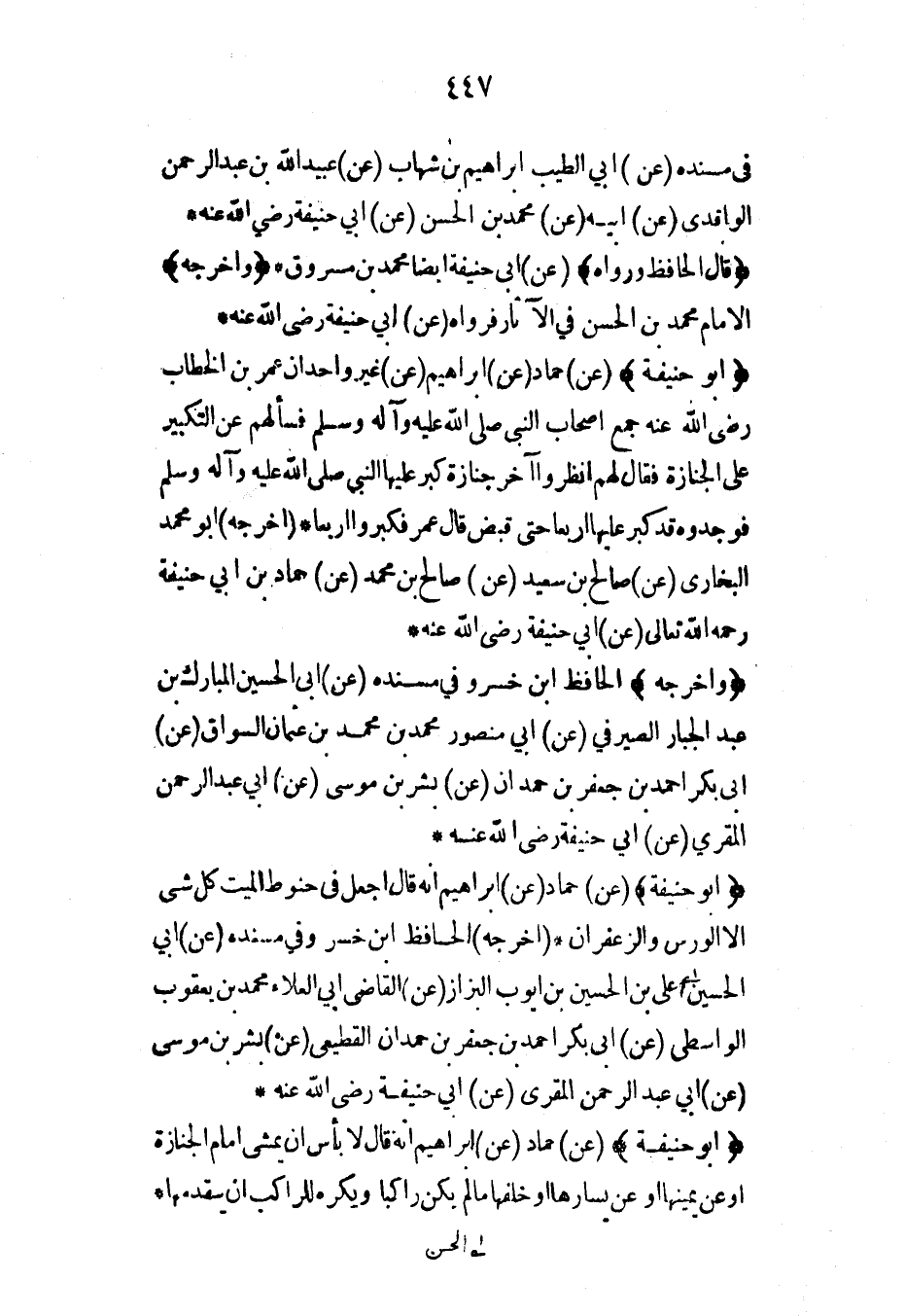 (أبو حنيفة) (عن) حماد (عن) إبراهيم (عن) غير واحد أن عمر بن الخطاب رضي الله عنه جمع أصحاب النبي صلى الله عليه وآله وسلم فسألهم عن التكبير على الجنازة فقال لهم انظروا آخر جنازة كبر عليها النبي صلى الله عليه وآله وسلم فوجدوه قد كبر عليها أربعاً حتى قبض قال عمر فكبروا أربعاً* (أخرجه) أبو محمد البخاري (عن) صالح بن سعيد (عن) صالح بن محمد (عن) حماد بن أبي حنيفة رحمه الله تعالى (عن) أبي حنيفة رضي الله عنه*