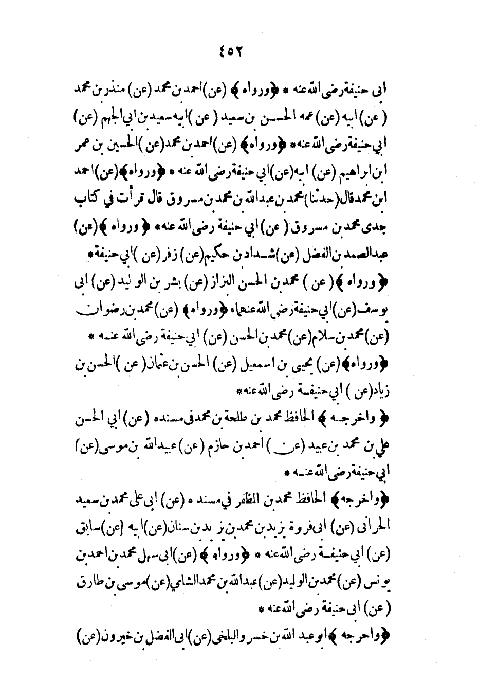 أبي حنيفة رضي الله عنه* (ورواه) (عن) أحمد بن محمد (عن) منذر بن محمد (عن) أبيه (عن) عمه الحسن بن سعيد (عن) أبيه سعيد بن أبي الجهم (عن) أبي حنيفة رضي الله عنه* (ورواه) (عن) أحمد بن محمد (عن) الحسين بن عمر ابن إبراهيم (عن) أبيه (عن) أبي حنيفة رضي الله عنه* (ورواه) (عن) أحمد ابن محمد قال (حدثنا) محمد بن عبد الله بن محمد بن مسروق قال قرأت في كتاب جدي محمد بن مسروق (عن) أبي حنيفة رضي الله عنه* (ورواه) (عن) عبد الصمد بن الفضل (عن) شداد بن حكيم (عن) زفر (عن) أبي حنيفة*