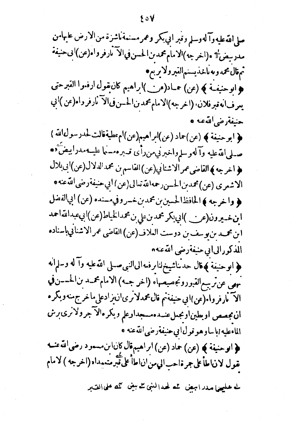 (أبو حنيفة) (عن) حماد (عن) إبراهيم (عن) أم عطية قالت لحد رسول الله صلى الله عليه وآله وسلم وأخبرني من رأى قبره مسنماً عليه مدر أبيض* (أخرجه) القاضي عمر الأشناني (عن) القاسم بن محمد الدلال (عن) أبي بلال الأشعري (عن) محمد بن الحسن رحمه الله تعالى (عن) أبي حنيفة رضي الله عنه*