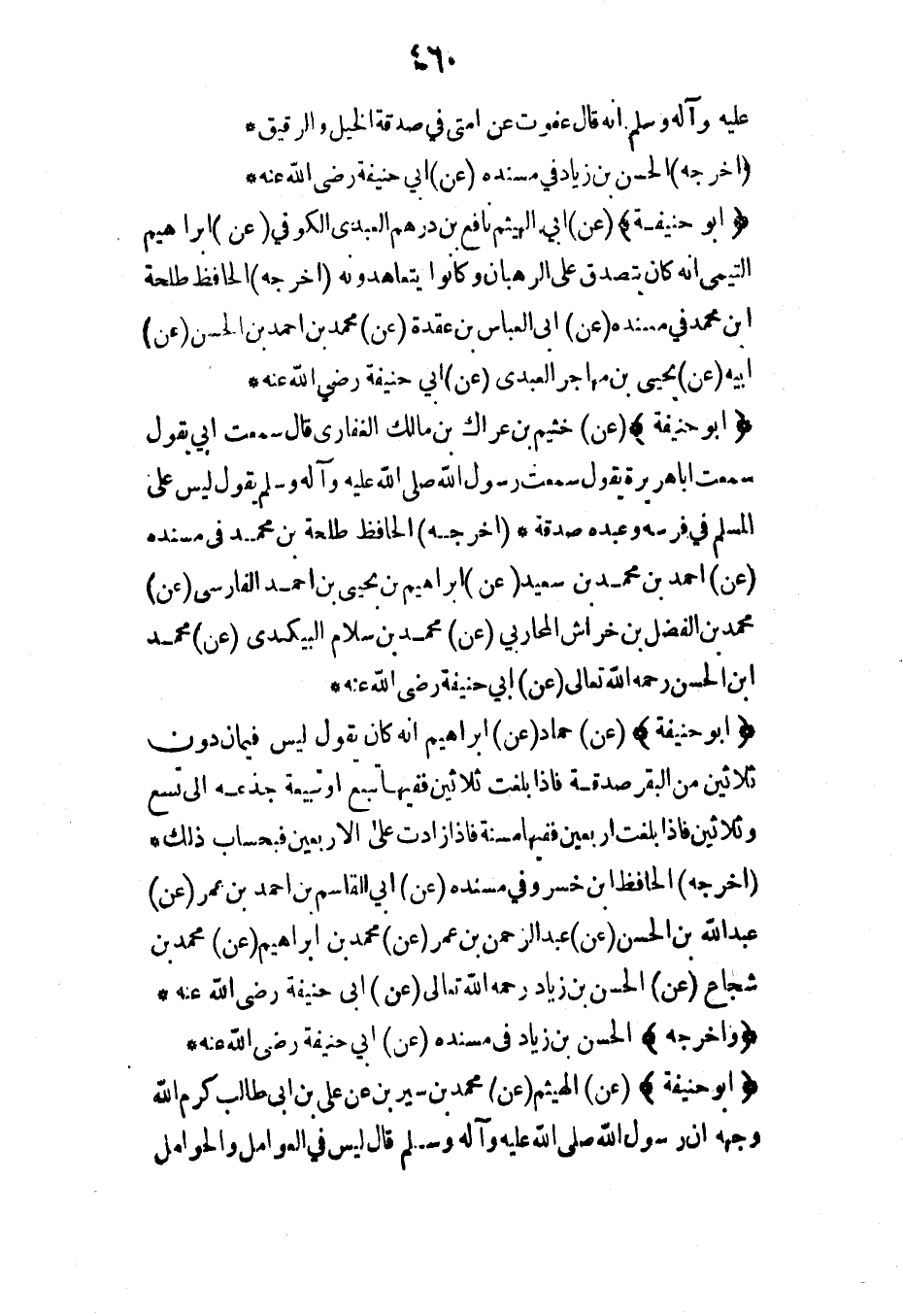 (أبو حنيفة) (عن) خثيم بن عراك بن مالك الغفاري قال سمعت أبي يقول سمعت أبا هريرة يقول سمعت رسول الله صلى الله عليه وآله وسلم يقول ليس على المسلم في فرسه وعبده صدقة* (أخرجه) الحافظ طلحة بن محمد في مسنده (عن) أحمد بن محمد بن سعيد (عن) إبراهيم بن يحيى بن أحمد الفارسي (عن) محمد بن الفضل بن خراش المحاربي (عن) محمد بن سلام البيكندي (عن) محمد ابن الحسن رحمه الله تعالى (عن) أبي حنيفة رضي الله عنه*