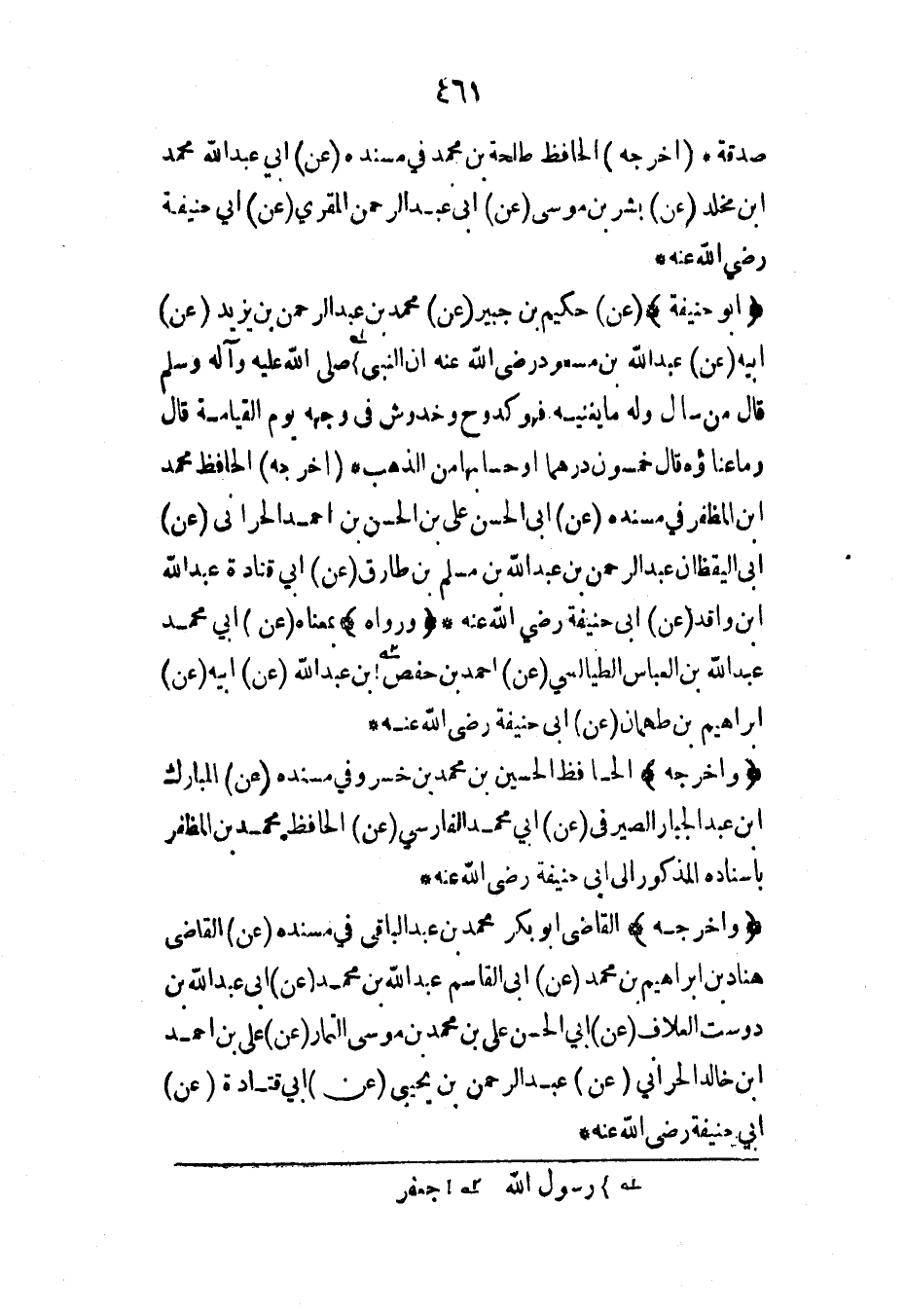 (أبو حنيفة) (عن) حكيم بن جبير (عن) محمد بن عبد الرحمن بن يزيد (عن) أبيه (عن) عبد الله بن مسعود رضي الله عنه أن النبي صلى الله عليه وآله وسلم قال من سأل وله ما يغنيه فهو كدوح وخدوش في وجهه يوم القيامة قال وما عناؤه قال خمسون درهماً أو حسابها من الذهب* (أخرجه) الحافظ محمد ابن المظفر في مسنده (عن) أبي الحسن علي بن الحسن بن أحمد الحراني (عن) أبي اليقظان عبد الرحمن بن عبد الله بن مسلم بن طارق (عن) أبي قتادة عبد الله ابن واقد (عن) أبي حنيفة رضي الله عنه* (ورواه) بمعناه (عن) أبي محمد عبد الله بن العباس الطيالسي (عن) أحمد بن حفص ابن عبد الله (عن) أبيه (عن) إبراهيم بن طهمان (عن) أبي حنيفة رضي الله عنه*