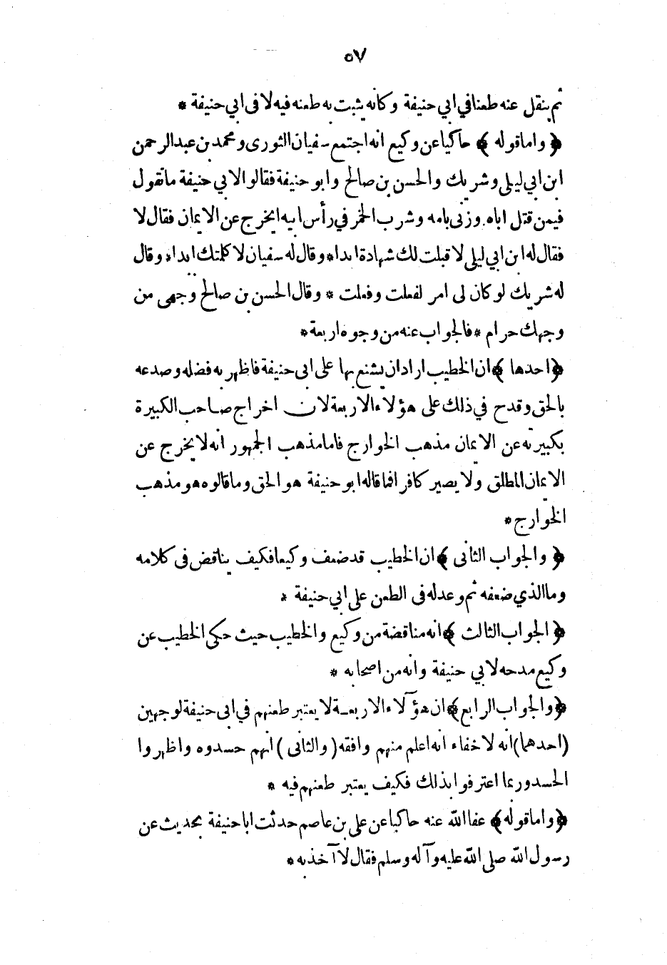 (وأما قوله) حاكياً عن وكيع أنه اجتمع سفيان الثوري ومحمد بن عبد الرحمن ابن أبي ليلى وشريك والحسن بن صالح وأبو حنيفة فقالوا لأبي حنيفة ما تقول فيمن قتل أباه وزنى بأمه وشرب الخمر في رأس أبيه أيخرج عن الإيمان فقال لا فقال له ابن أبي ليلى لا قبلت لك شهادة أبداً* وقال له سفيان لا كلمتك أبداً* وقال له شريك لو كان لي أمر لفعلت وفعلت* وقال الحسن بن صالح وجهي من وجهك حرام* فالجواب عنه من وجوه أربعة*