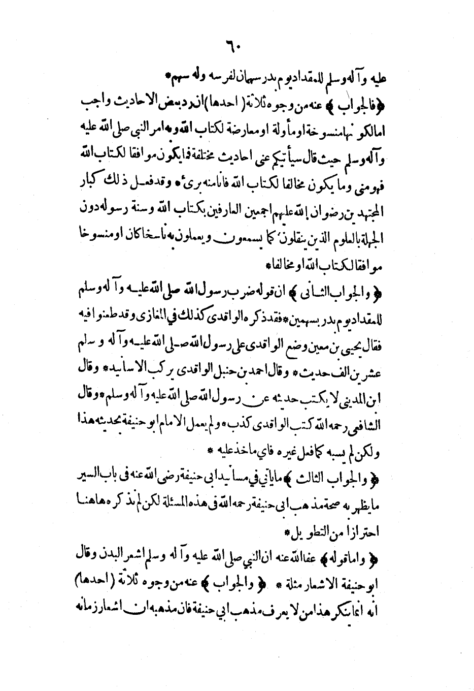 (والجواب الثاني) أن قوله ضرب رسول الله صلى الله عليه وآله وسلم للمقداد يوم بدر بسهمين* فقد ذكره الواقدي كذلك في المغازي وقد طعنوا فيه فقال يحيى بن معين وضع الواقدي على رسول الله صلى الله عليه وآله وسلم عشرين ألف حديث* وقال أحمد بن حنبل الواقدي يركب الأسانيد* وقال ابن المديني لا يكتب حديثه عن رسول الله صلى الله عليه وآله وسلم* وقال الشافعي رحمه الله كتب الواقدي كذب* ولم يعمل الإمام أبو حنيفة بحديثه هذا ولكن لم يسبه كما فعل غيره فأي مأخذ عليه*