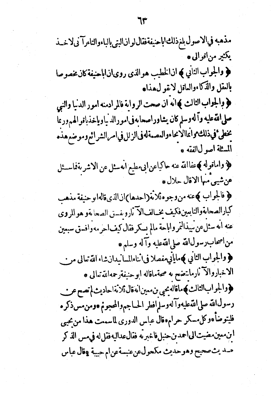 (فالجواب) عنه من وجوه ثلاثة (أحدها) أن الذي قاله أبو حنيفة مذهب كبار الصحابة والتابعين فكيف يخالف الآثار ويفسق الصحابة وهو المروي عنه أنه سئل عن نبيذ التمر وإباحة ما لم يسكر فقال كيف أحرمه وأفسق سبعين من أصحاب رسول الله صلى الله عليه وآله وسلم*