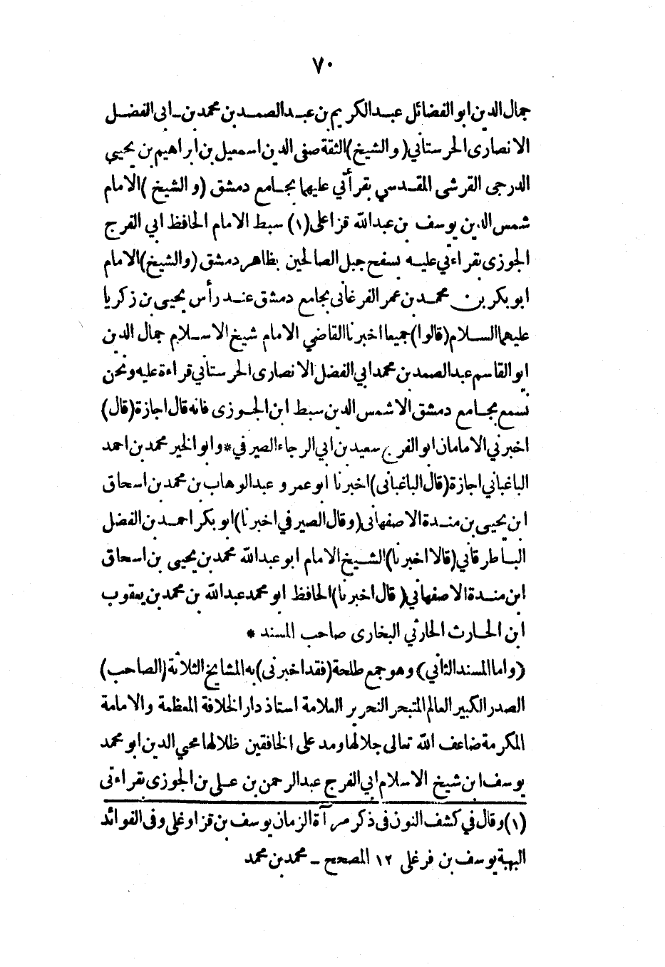 جمال الدين أبو الفضائل عبد الكريم بن عبد الصمد بن محمد بن أبي الفضل الأنصاري الحرستاني (والشيخ) الثقة صفي الدين إسماعيل بن إبراهيم بن يحيى الدرجي القرشي المقدسي بقراءتي عليهما بجامع دمشق (والشيخ) الإمام شمس الدين يوسف بن عبد الله قزاعلي سبط الإمام الحافظ أبي الفرج الجوزي بقراءتي عليه بسفح جبل الصالحين بظاهر دمشق (والشيخ) الإمام أبو بكر بن محمد بن عمر الفرغاني بجامع دمشق عند رأس يحيى بن زكريا عليهما السلام (قالوا) جميعاً أخبرنا القاضي الإمام شيخ الإسلام جمال الدين أبو القاسم عبد الصمد بن محمد أبي الفضل الأنصاري الحرستاني قراءة عليه ونحن نسمع بجامع دمشق إلا شمس الدين سبط ابن الجوزي فإنه قال إجازة (قال) أخبرني الإمامان أبو الفرج سعيد بن أبي الرجاء الصيرفي* وأبو الخير محمد بن أحمد الباغباني إجازة (قال الباغباني) أخبرنا أبو عمرو عبد الوهاب بن محمد بن إسحاق ابن يحيى بن مندة الأصفهاني (وقال الصيرفي أخبرنا) أبو بكر أحمد بن الفضل الباطرقاني (قالا أخبرنا) الشيخ الإمام أبو عبد الله محمد بن يحيى بن إسحاق ابن مندة الأصفهاني (قال أخبرنا) الحافظ أبو محمد عبد الله بن محمد بن يعقوب ابن الحارث الحارثي البخاري صاحب المسند*