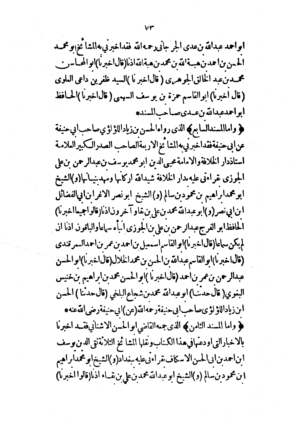 (وأما المسند السابع) الذي رواه الحسن بن زياد اللؤلؤي صاحب أبي حنيفة عن أبي حنيفة فقد أخبرني به المشائخ الأربعة الصاحب الصدر الكبير العلامة أستاذ دار الخلافة والإمامة محيي الدين أبو محمد يوسف بن عبد الرحمن بن علي الجوزي بقراءتي عليه بدار الخلافة شيد الله أركانها ومهد بنيانها (و) الشيخ أبو محمد إبراهيم بن محمود بن سالم (و) الشيخ أبو نصر الأغر ابن أبي الفضائل ابن أبي نصر (و) أبو عبد الله محمد بن علي بن بقا وآخرون إذناً (قالوا جميعاً أخبرنا) الحافظ أبو الفرج عبد الرحمن بن علي بن الجوزي أنبأه سماعاً والباقون إذناً إن لم يكن سماعاً (قال أخبرنا) أبو القاسم إسماعيل بن أحمد بن عمر بن أحمد السمرقندي (قال أخبرنا) أبو القاسم عبد الله بن الحسن بن محمد الخلال (قال أخبرنا) أبو الحسن عبد الرحمن بن عمر بن أحمد (قال أخبرنا) أبو الحسن محمد بن إبراهيم بن خنيس البغوي (قال حدثنا) أبو عبد الله محمد بن شجاع البلخي (قال حدثنا) الحسن ابن زياد اللؤلؤي صاحب أبي حنيفة رحمه الله (عن) أبي حنيفة رضي الله عنه*