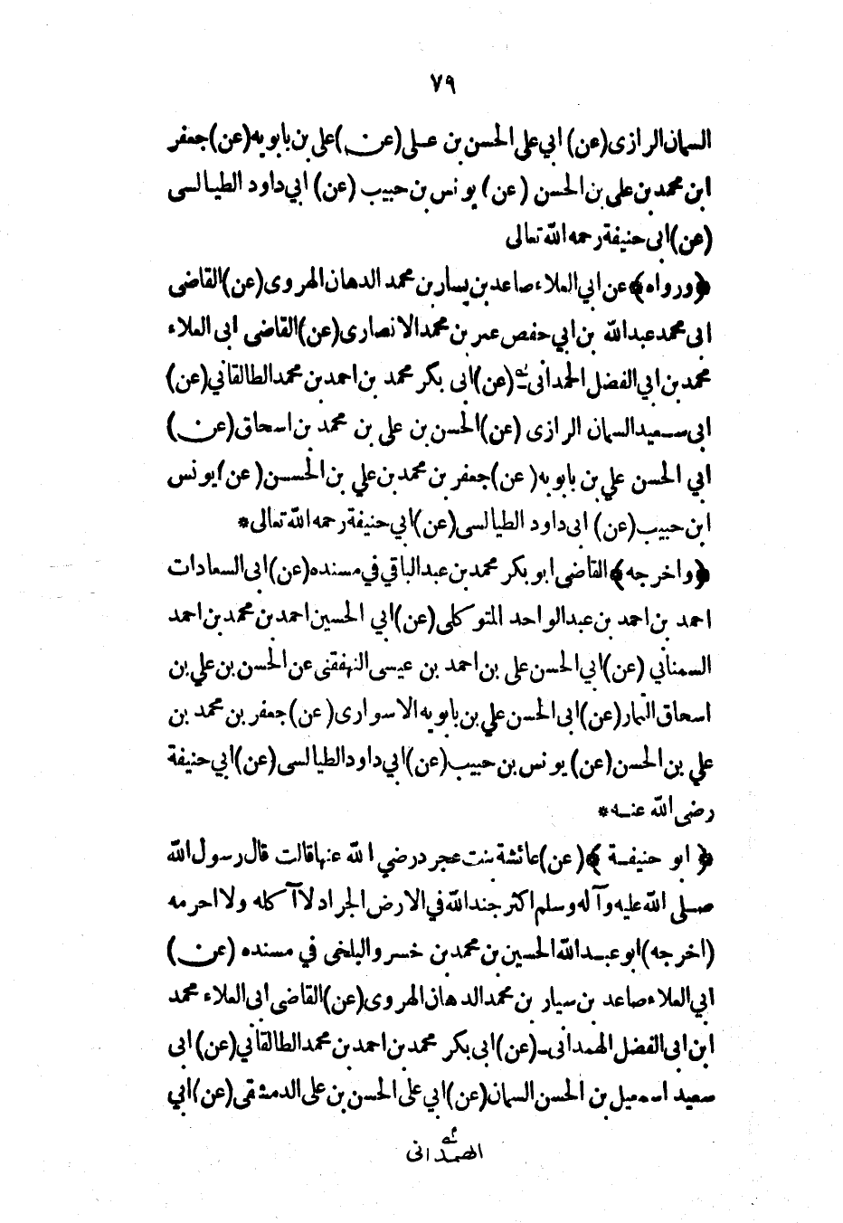 (ورواه) عن أبي العلاء صاعد بن يسار بن محمد الدهان الهروي (عن) القاضي أبي محمد عبد الله بن أبي حفص عمر بن محمد الأنصاري (عن) القاضي أبي العلاء محمد بن أبي الفضل الحمداني (عن) أبي بكر محمد بن أحمد بن محمد الطالقاني (عن) أبي سعيد السمان الرازي (عن) الحسن بن علي بن محمد بن إسحاق (عن) أبي الحسن علي بن بابويه (عن) جعفر بن محمد بن علي بن الحسن (عن) يونس ابن حبيب (عن) أبي داود الطيالسي (عن) أبي حنيفة رحمه الله تعالى*