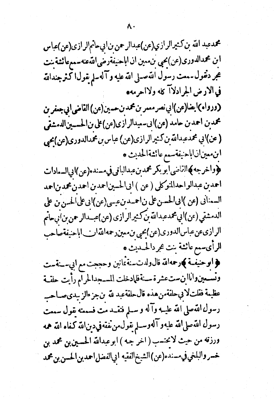 (أبو حنيفة) رحمه الله قال ولدت سنة ثمانين وحججت مع أبي سنة ست وتسعين وأنا ابن ست عشرة سنة فلما دخلت المسجد الحرام رأيت حلقة عظيمة فقلت لأبي حلقة من هذه قال حلقة عبد الله بن جزء الزبيدي صاحب رسول الله صلى الله عليه وآله وسلم فتقدمت فسمعته يقول سمعت رسول الله صلى الله عليه وآله وسلم يقول من تفقه في دين الله كفاه الله همه ورزقه من حيث لا يحتسب (أخرجه) أبو عبد الله الحسين بن محمد بن خسرو البلخي في مسنده (عن) الشيخ الفقيه أبي الفضل أحمد بن الحسن بن محمد