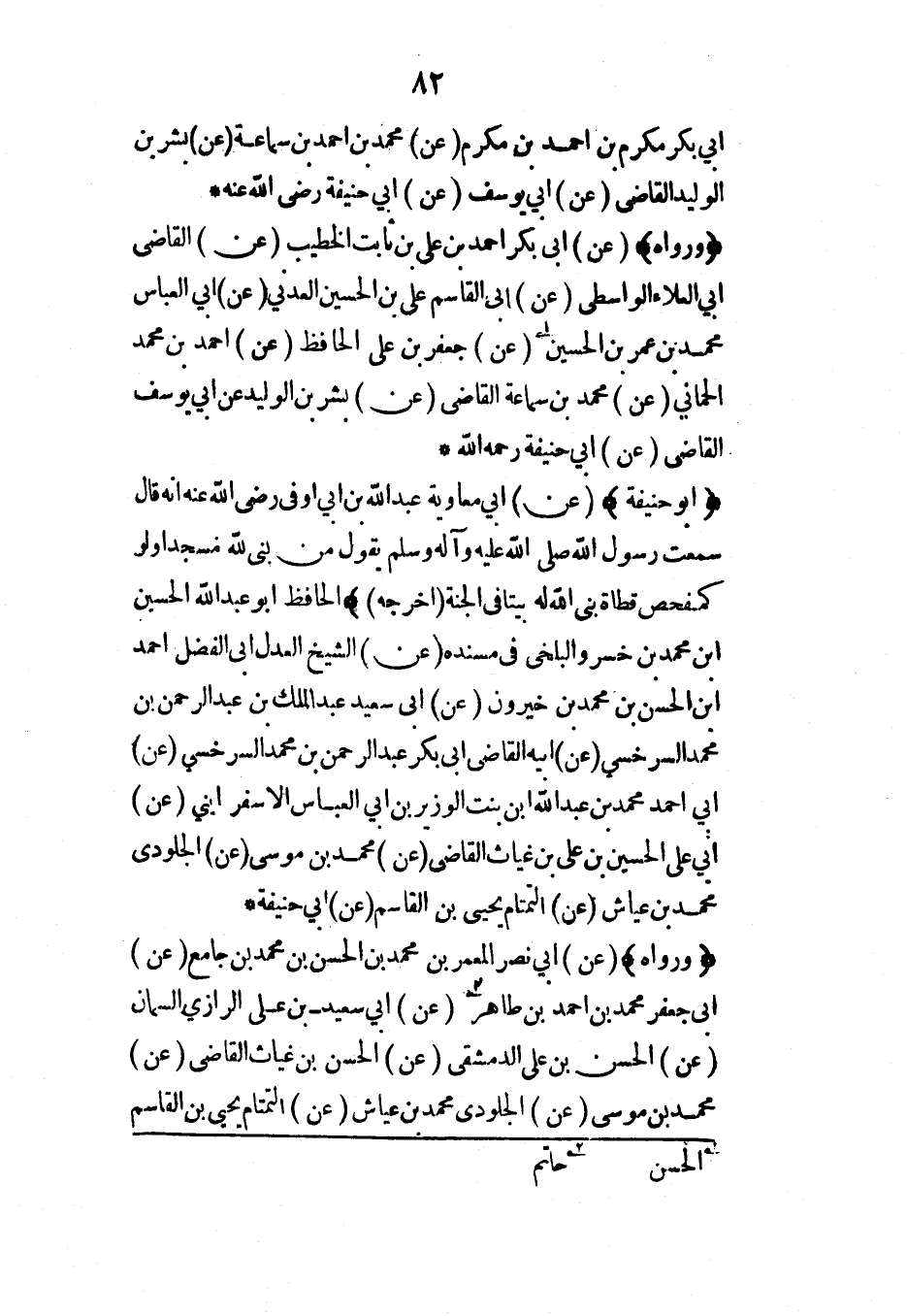 (ورواه) (عن) أبي بكر أحمد بن علي بن ثابت الخطيب (عن) القاضي أبي العلاء الواسطي (عن) أبي القاسم علي بن الحسين العدني (عن) أبي العباس محمد بن عمر بن الحسين (عن) جعفر بن علي الحافظ (عن) أحمد بن محمد الحماني (عن) محمد بن سماعة القاضي (عن) بشر بن الوليد عن أبي يوسف القاضي (عن) أبي حنيفة رحمه الله*