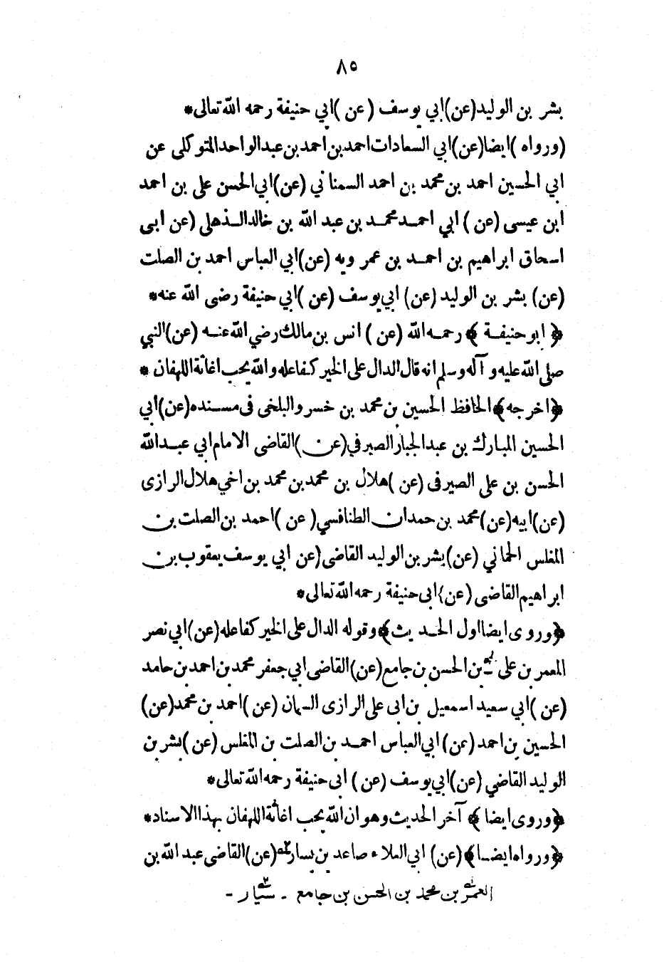 (وروى أيضاً أول الحديث) وقوله الدال على الخير كفاعله (عن) أبي نصر المعمر بن علي بن الحسن بن جامع (عن) القاضي أبي جعفر محمد بن أحمد بن حامد (عن) أبي سعيد إسماعيل بن أبي علي الرازي السمان (عن) أحمد بن محمد (عن) الحسين بن أحمد (عن) أبي العباس أحمد بن الصلت بن المغلس (عن) بشر بن الوليد القاضي (عن) أبي يوسف (عن) أبي حنيفة رحمه الله تعالى*