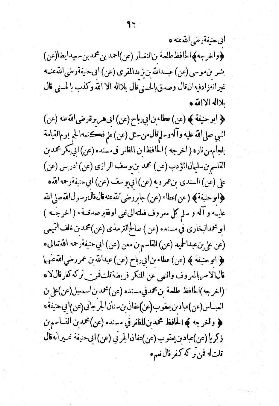 (أبو حنيفة) (عن) عطاء بن أبي رباح (عن) عبد الله بن عمر رضي الله عنهما قال الأمر بالمعروف والنهي عن المنكر فريضة قلت فمن تركه كفر قال لا* (أخرجه) الحافظ طلحة بن محمد في مسنده (عن) محمد بن إسماعيل (عن) علي بن العباس (عن) عباد بن يعقوب (عن) عفان بن سنان الجرجاني (عن) أبي حنيفة*