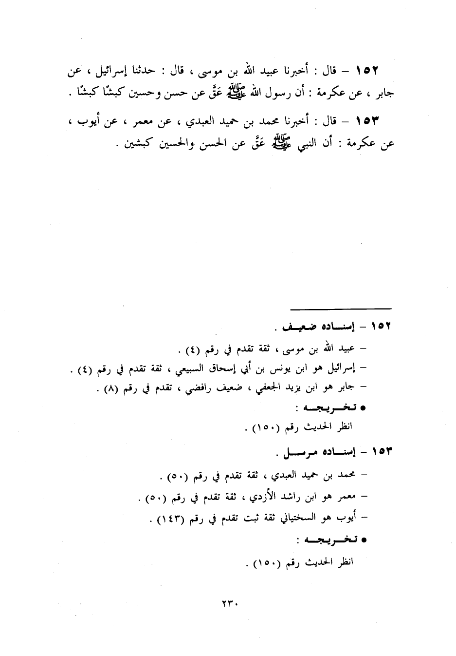 152- قال: أخبرنا عبيد الله بن موسى. قال: حدثنا إسرائيل. عن جابر. عن عكرمة: أن رسول الله ص عق عن حسن وحسين كبشا كبشا.