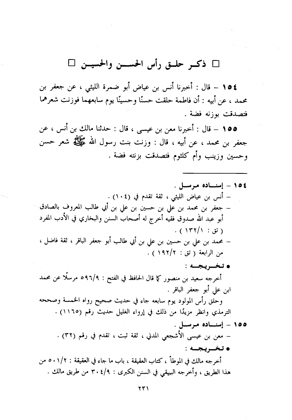 154- قال: أخبرنا أنس بن عياض أبو ضمرة الليثي. [عن جعفر بن محمد. عن أبيه: أن فاطمة حلقت حسنا وحسينا يوم سابعهما فوزنت شعرهما فتصدقت بوزنه فضة] .