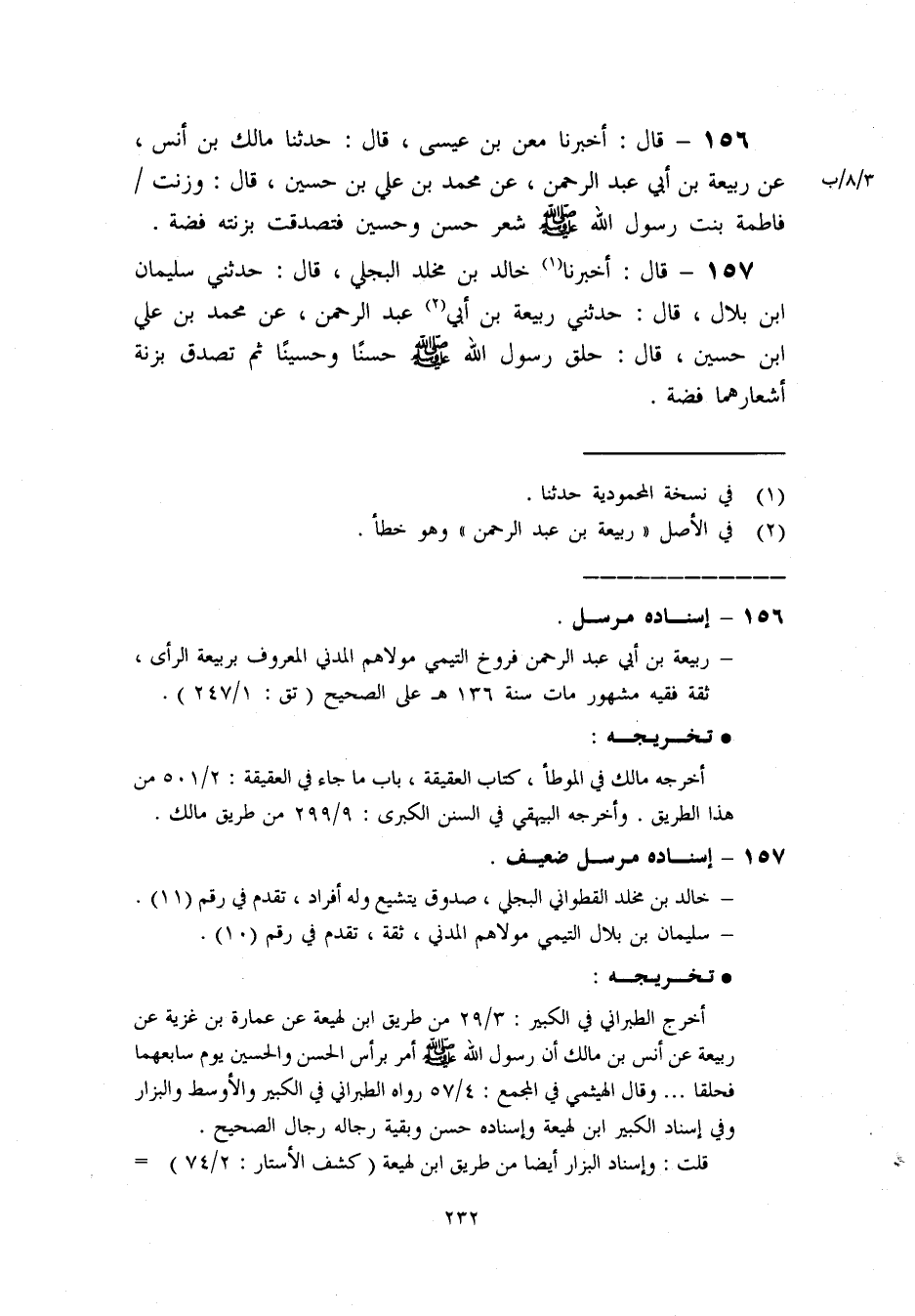 157- قال: أخبرنا «1» خالد بن مخلد البجلي. قال: حدثني سليمان ابن بلال. قال: حدثني ربيعة بن أبي «2» عبد الرحمن. [عن محمد بن علي ابن حسين. قال: حلق رسول الله ص حسنا وحسينا ثم تصدق بزنة أشعارهما فضة] .
