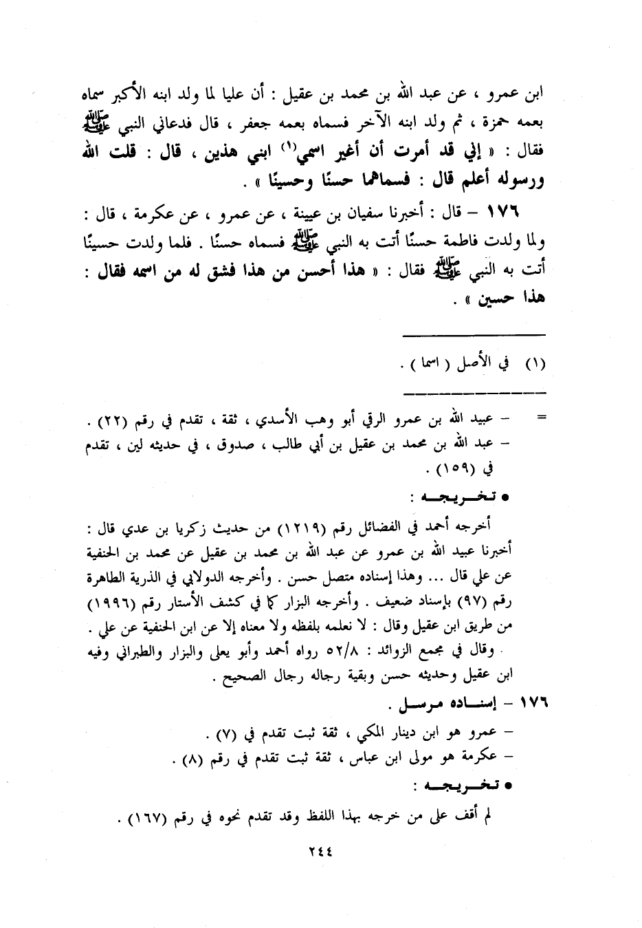 ابن عمرو. [عن عبد الله بن محمد بن عقيل: أن عليا لما ولد ابنه الأكبر سماه بعمه حمزة. ثم ولد ابنه الآخر فسماه بعمه جعفر. قال فدعاني النبي ص فقال:، إني قد أمرت أن أغير اسمي «1» ابني هذين. قال: قلت الله ورسوله أعلم قال: فسماهما حسنا وحسينا] ،.