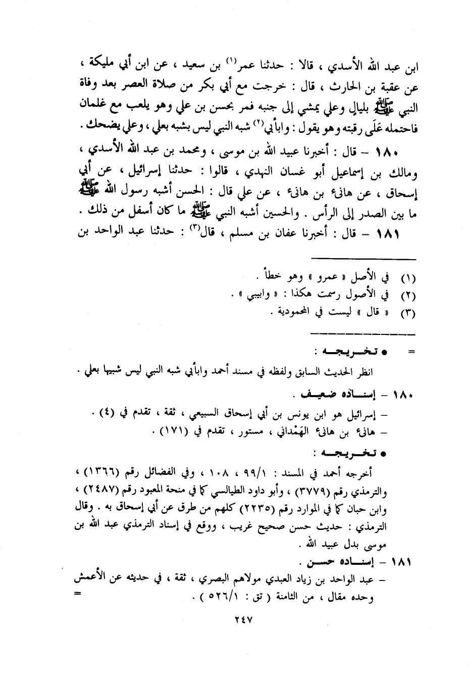 ومالك بن إسماعيل أبو غسان النهدي. قالوا: حدثنا إسرائيل. عن أبي إسحاق. عن هانئ بن هانئ. [عن علي قال: الحسن أشبه رسول الله ص ما بين الصدر إلى الرأس. والحسين أشبه النبي ص ما كان أسفل من ذلك] .