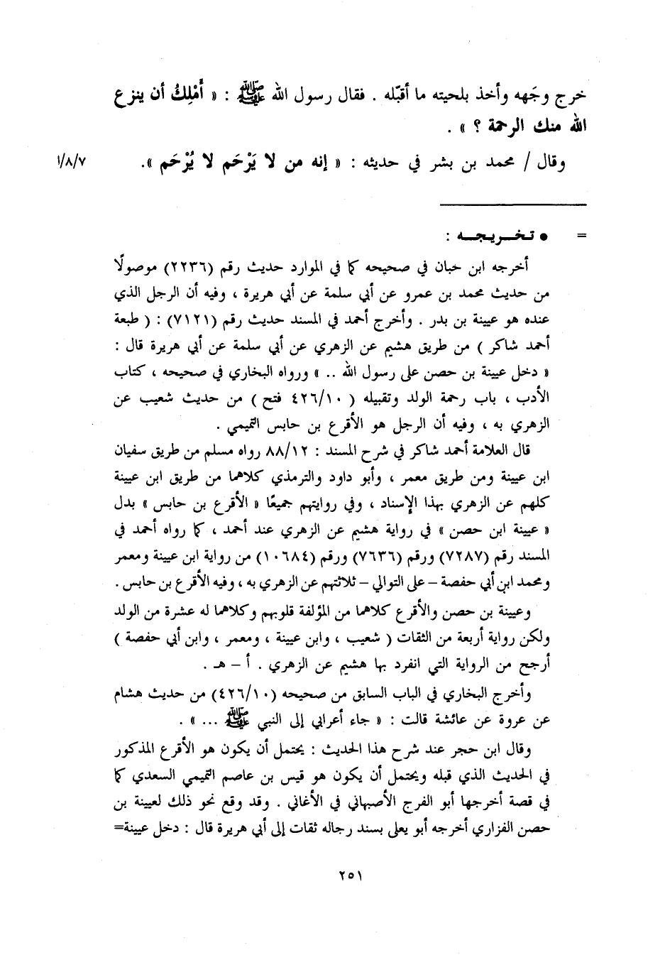 خرج وجهه وأخذ بلحيته ما أقبله. [فقال رسول الله ص:، أملك أن ينزع الله منك الرحمة؟] ،.