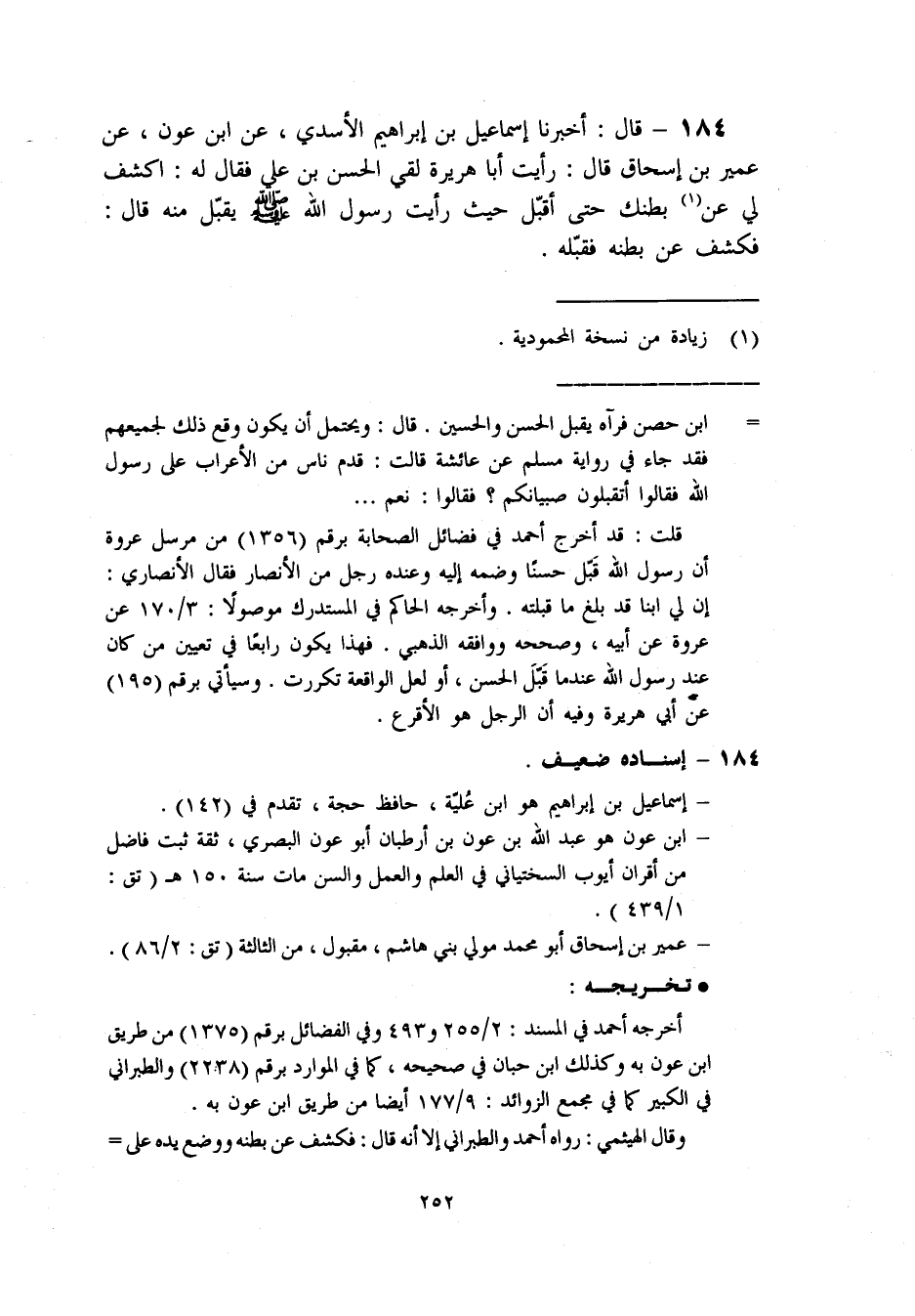 184- قال: أخبرنا إسماعيل بن إبراهيم الأسدي. عن ابن عون. عن عمير بن إسحاق قال: رأيت أبا هريرة لقي الحسن بن علي فقال له: اكشف لي عن «1» بطنك حتى أقبل حيث رأيت رسول الله ص يقبل منه قال: