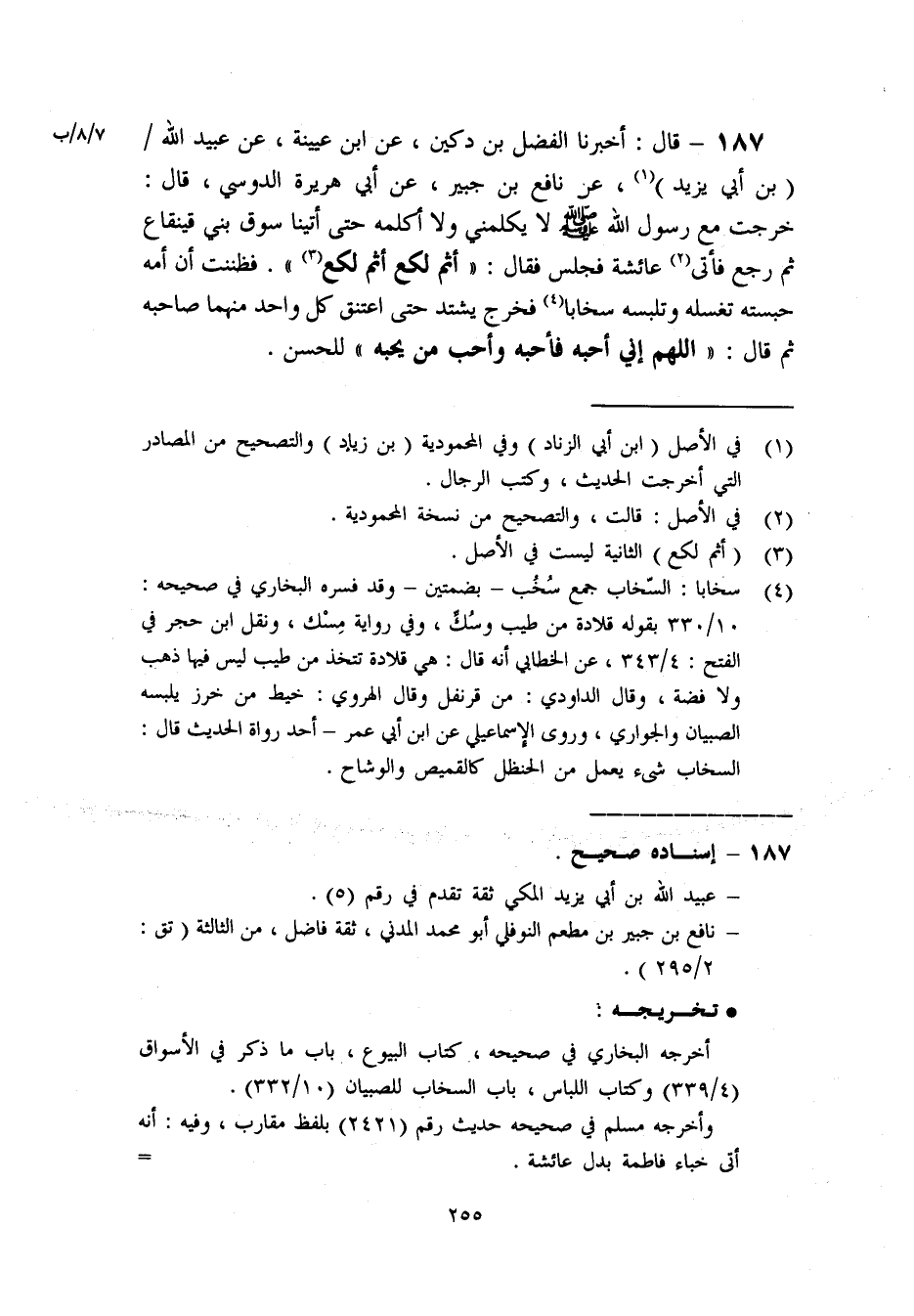 خرجت مع رسول الله ص لا يكلمني ولا أكلمه حتى أتينا سوق بني قينقاع ثم رجع فأتى «2» عائشة فجلس فقال:، إثم لكع إثم لكع «3» ،. فظننت أن أمه حبسته تغسله وتلبسه سخابا «4»