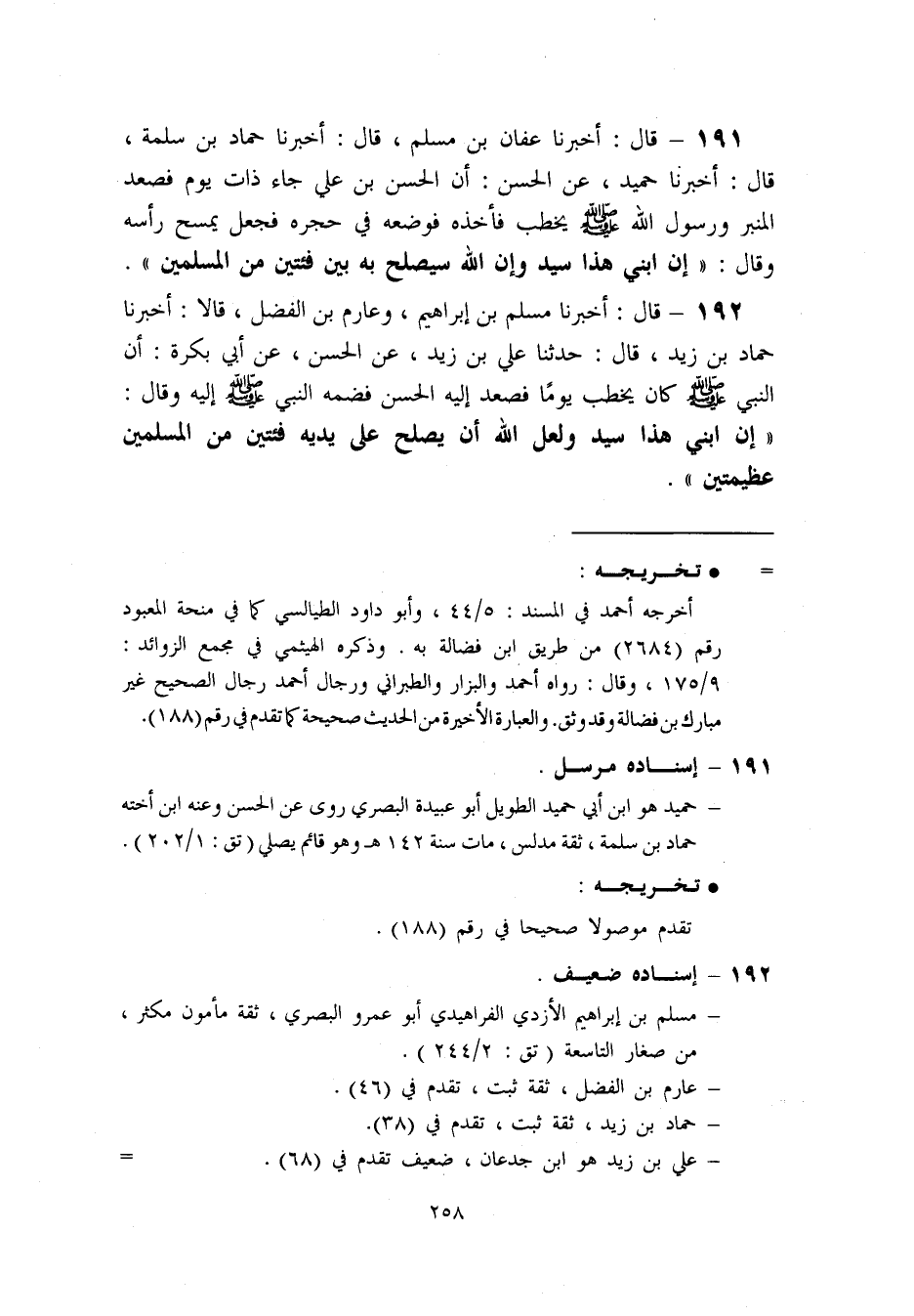 192- قال: أخبرنا مسلم بن إبراهيم. وعارم بن الفضل. قالا: أخبرنا حماد بن زيد. قال: حدثنا علي بن زيد. عن الحسن. [عن أبي بكرة: أن النبي ص كان يخطب يوما فصعد إليه الحسن فضمه النبي ص إليه وقال: