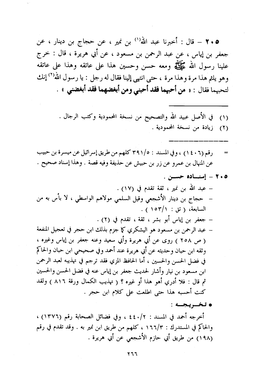 205- قال: أخبرنا عبد الله «1» بن نمير. عن حجاج بن دينار. عن جعفر بن أياس. عن عبد الرحمن بن مسعود. [عن أبي هريرة. قال: خرج علينا رسول الله ص ومعه حسن وحسين هذا على عاتقه وهذا على عاتقه وهو يلثم هذا مرة وهذا مرة. حتى انتهى إلينا فقال له رجل: يا رسول الله «2» إنك لتحبهما فقال:، من أحبهما فقد أحبني ومن أبغضهما فقد أبغضني] ،.