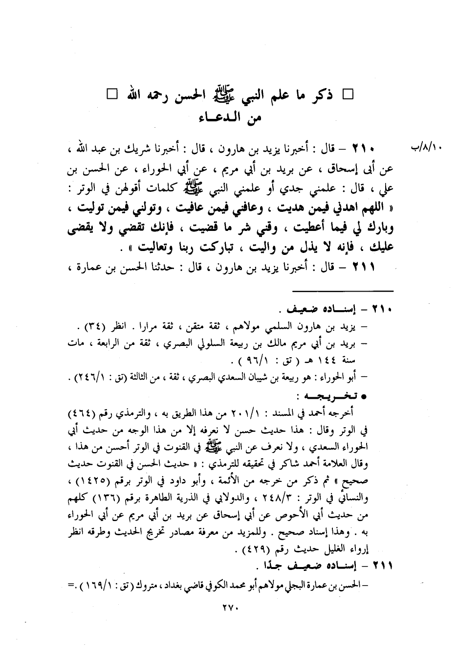 وقال العلامة أحمد شاكر في تحقيقه للترمذي:، حديث الحسن في القنوت حديث صحيح، ثم ذكر من خرجه من الأئمة. وأبو داود في الوتر برقم (1425) ، والنسائي في الوتر: 3/ 248. والدولابي في الذرية الطاهرة برقم (136) كلهم من حديث أبي الأحوص عن أبي إسحاق عن بريد بن أبي مريم عن أبي الحوراء به. وهذا إسناد صحيح. وللمزيد من معرفة مصادر تخريج الحديث وطرقه انظر إرواء الغليل حديث رقم (429) .