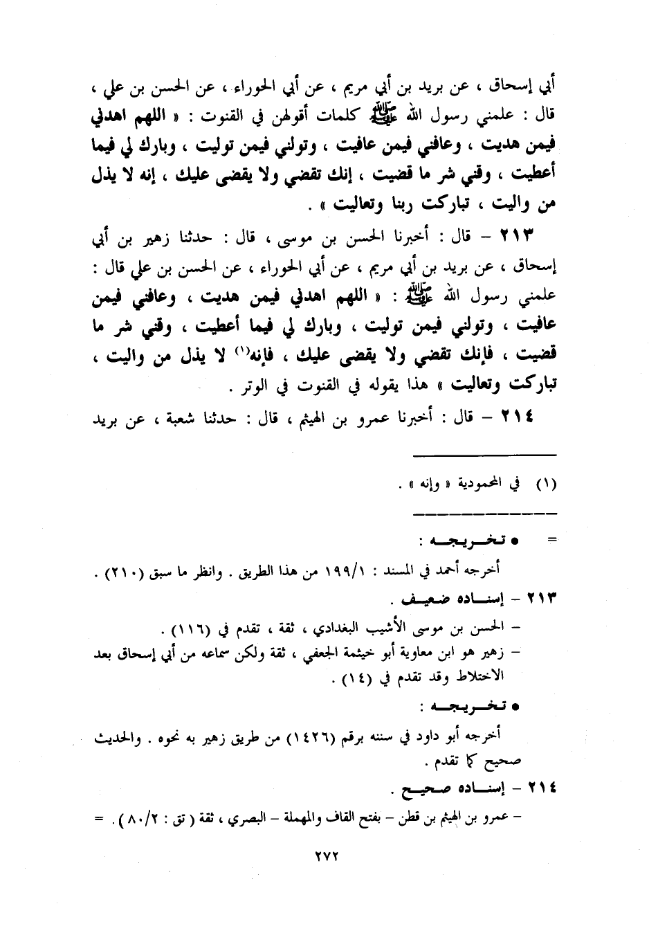 [قال: علمني رسول الله ص كلمات أقولهن في القنوت:، اللهم اهدني فيمن هديت. وعافني فيمن عافيت. وتولني فيمن توليت. وبارك لي فيما أعطيت. وقني شر ما قضيت. إنك تقضي ولا يقضى عليك. إنه لا يذل من واليت. تباركت ربنا وتعاليت] ،.