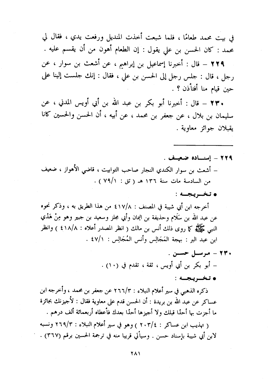 229- قال: أخبرنا إسماعيل بن إبراهيم. عن أشعث بن سوار. عن رجل. قال: جلس رجل إلى الحسن بن علي. فقال: إنك جلست إلينا على حين قيام منا أفتأذن؟.