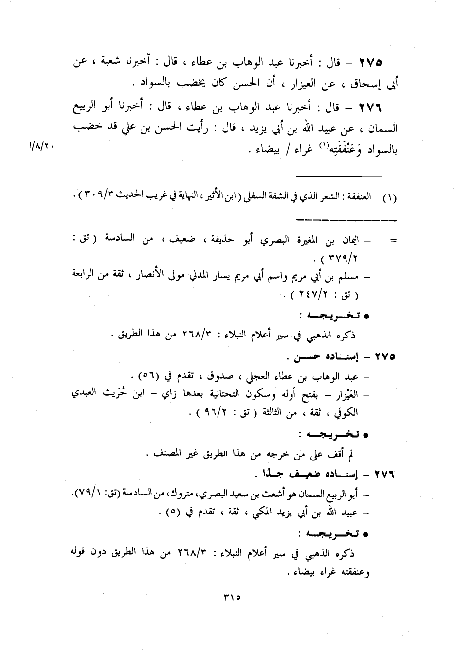 275- قال: أخبرنا عبد الوهاب بن عطاء. قال: أخبرنا شعبة. عن أبي إسحاق. عن العيزار. أن الحسن كان يخضب بالسواد.