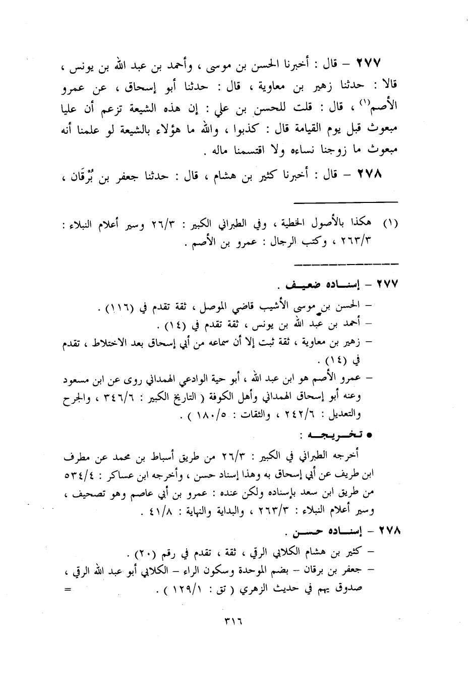 - عمرو الأصم هو ابن عبد الله. أبو حية الوادعي الهمداني روى عن ابن مسعود وعنه أبو إسحاق الهمداني وأهل الكوفة (التاريخ الكبير: 6/ 346، والجرح والتعديل: 6/ 242، والثقات: 5/ 180) .
