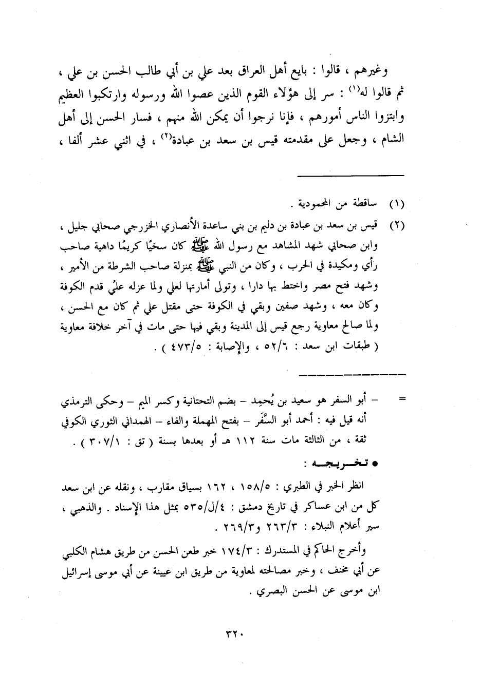 (2) قيس بن سعد بن عباده بن دليم بن بني ساعدة الأنصاري الخزرجي صحابي جليل. وابن صحابي شهد المشاهد مع رسول الله ص كان سخيا كريما داهية صاحب رأى ومكيدة في الحرب. وكان من النبي ص بمنزلة صاحب الشرطة من الأمير. وشهد فتح مصر واختط بها دارا. وتولى إمارتها لعلي ولما عزله علي قدم الكوفة وكان معه. وشهد صفين وبقي في الكوفة حتى مقتل علي ثم كان مع الحسن. ولما صالح معاوية رجع قيس إلى المدينة وبقي فيها حتى مات في آخر خلافة معاوية (طبقات ابن سعد: 6/ 52، والإصابة: 5/ 473) .