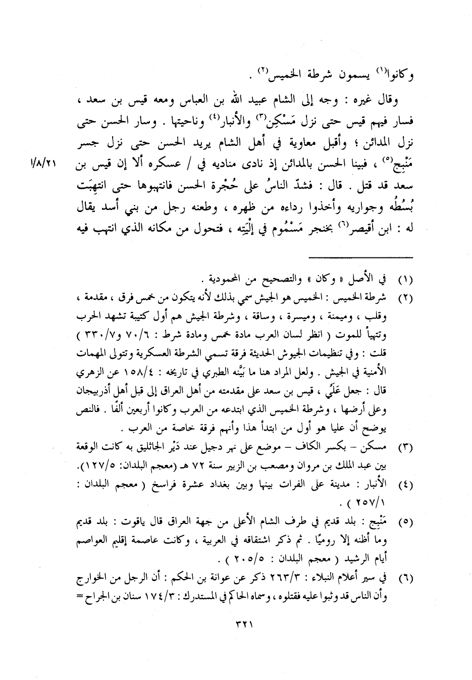 (6) في سير أعلام النبلاء: 3/ 263 ذكر عن عوانة بن الحكم: أن الرجل من الخوارج وأن الناس قد وثبوا عليه فقتلوه. وسماه الحاكم في المستدرك: 3/ 174 سنان بن الجراح الأسدي أخو بني نصر وقال: وثب عليه عبد الله بن ظبيان بن عمارة التميمي فعض وجهه وشدخ رأسه بحجر فمات من وقته.