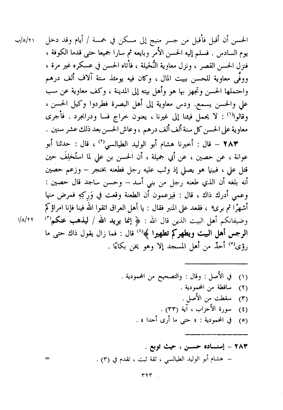 283- قال: أخبرنا هشام أبو الوليد الطيالسي «2» . قال: حدثنا أبو عوانة. عن حصين. عن أبي جميلة. أن الحسن بن علي لما استخلف حين قتل علي. فبينما هو يصلي إذ وثب عليه رجل فطعنه بخنجر- وزعم حصين أنه بلغه أن الذي طعنه رجل من بني أسد- وحسن ساجد قال حصين: