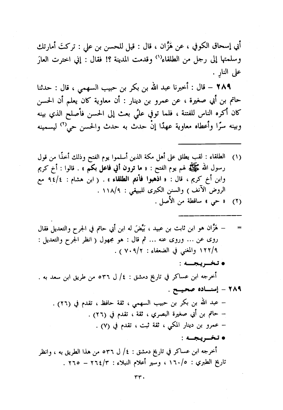 أبي إسحاق الكوفي. عن هزان. قال: [قيل للحسن بن علي: تركت إمارتك وسلمتها إلى رجل من الطلقاء «1» وقدمت المدينة؟! فقال: إني اخترت العار على النار.]