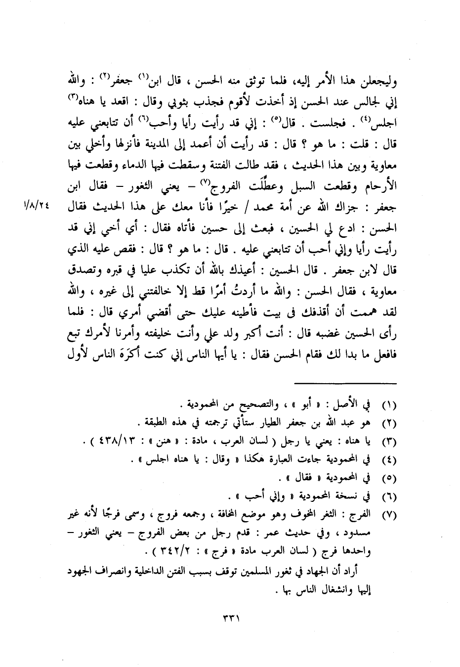 (7) الفرج: الثغر المخوف وهو موضع المخافة. وجمعه فروج. وسمي فرجا لأنه غير مسدود. وفي حديث عمر: قدم رجل من بعض الفروج- يعني الثغور- واحدها فرج (لسان العرب مادة، فرج،: 2/ 342) . أراد أن الجهاد في ثغور المسلمين توقف بسبب الفتن الداخلية وانصراف الجهود إليها وانشغال الناس بها.