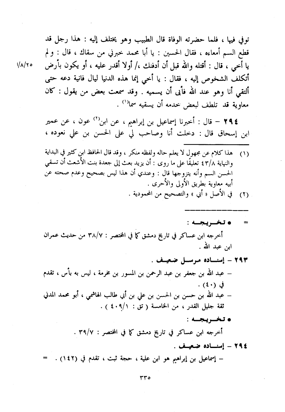(1) هذا كلام عن مجهول لا يعلم حاله ولفظه منكر. وقد قال الحافظ ابن كثير في البداية والنهاية 8/ 43 تعليقا على ما روى: أن يزيد بعث إلى جعدة بنت الأشعث أن تسقي الحسن السم وإنه يتزوجها قال: وعندي أن هذا ليس بصحيح وعدم صحته عن أبيه معاوية بطريق الأولى والأحرى.