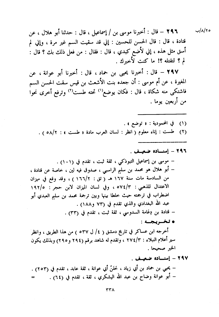 296- قال: أخبرنا موسى بن إسماعيل. قال: حدثنا أبو هلال. عن قتادة. [قال: قال الحسن للحسين: إني قد سقيت السم غير مرة. وإني لم أسق مثل هذه. إني لأضع كبدي. قال: فقال: من فعل ذلك بك؟ قال: