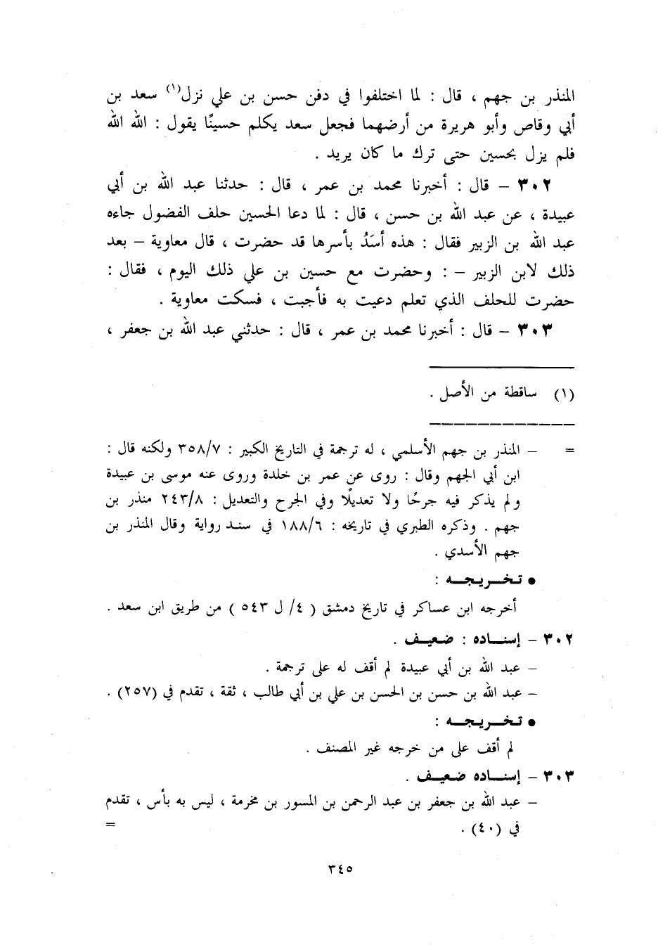 302- قال: أخبرنا محمد بن عمر. قال: حدثنا عبد الله بن أبي عبيدة. عن عبد الله بن حسن. قال: لما دعا الحسين حلف الفضول جاءه عبد الله بن الزبير فقال: هذه أسد بأسرها قد حضرت. قال معاوية- بعد ذلك لابن الزبير-: وحضرت مع حسين بن علي ذلك اليوم. فقال: