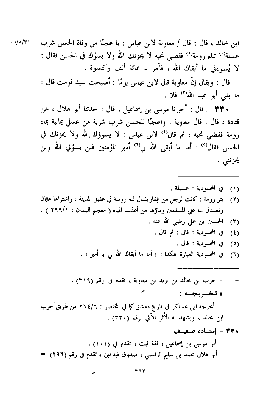 330- قال: أخبرنا موسى بن إسماعيل. قال: حدثنا أبو هلال. عن قتادة. قال: قال معاوية: وا عجبا للحسن شرب شربة من عسل يمانية بماء رومة فقضى نحبه. ثم قال «4» لابن عباس: لا يسوؤك الله ولا يحزنك في الحسن فقال»