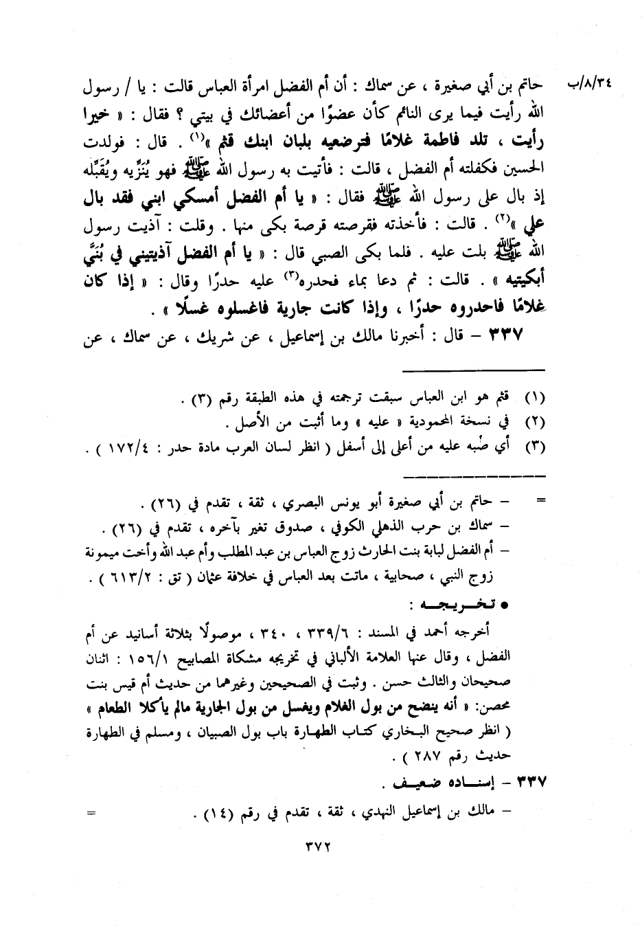 حاتم بن أبي صغيرة. عن سماك: أن أم الفضل امرأة العباس قالت: يا رسول الله رأيت فيما يرى النائم كأن عضوا من أعضائك في بيتي؟ [فقال:، خيرا رأيت. تلد فاطمة غلاما فترضعيه بلبان ابنك قثم، «1» . قال: فولدت الحسين فكفلته أم الفضل. قالت: فأتيت به رسول الله ص فهو ينزيه ويقبله إذ بال على رسول الله ص فقال:، يا أم الفضل أمسكي ابني فقد بال على، «2» . قالت: فأخذته فقرصته قرصة بكى منها. وقلت: آذيت رسول الله ص بلت عليه. فلما بكى الصبي قال:، يا أم الفضل آذيتيني في بني أبكيته،. قالت: ثم دعا بماء فحدره «3» عليه حدرا وقال:، إذا كان غلاما فاحدروه حدرا. وإذا كانت جارية فاغسلوه غسلا] ،.