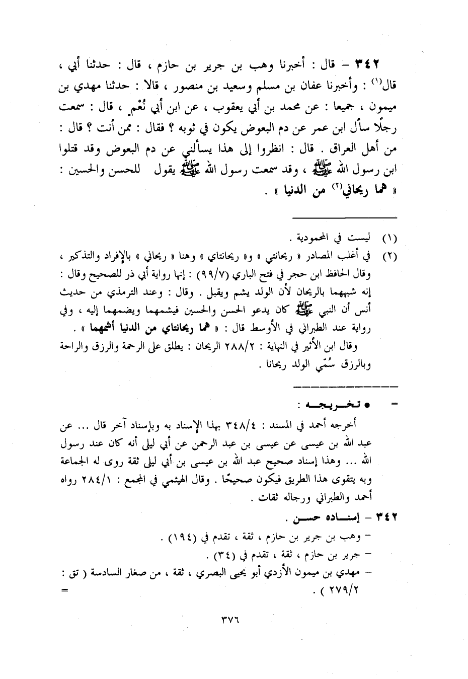 (2) في أغلب المصادر، ريحانتي، و، ريحانتاي، وهنا، ريحاني، بالإفراد والتذكير. وقال الحافظ ابن حجر في فتح الباري (7/ 99) : إنها رواية أبي ذر للصحيح وقال: إنه شبههما بالريحان لأن الولد يشم ويقبل. وقال: وعند الترمذي من حديث أنس أن النبي ص كان يدعو الحسن والحسين فيشمهما ويضمهما إليه. وفي رواية عند الطبراني في الأوسط قال:، هما ريحانتاي من الدنيا أشمهما،. وقال ابن الأثير في النهاية: 2/ 288 الريحان: يطلق على الرحمة والرزق والراحة وبالرزق سمي الولد ريحانا.