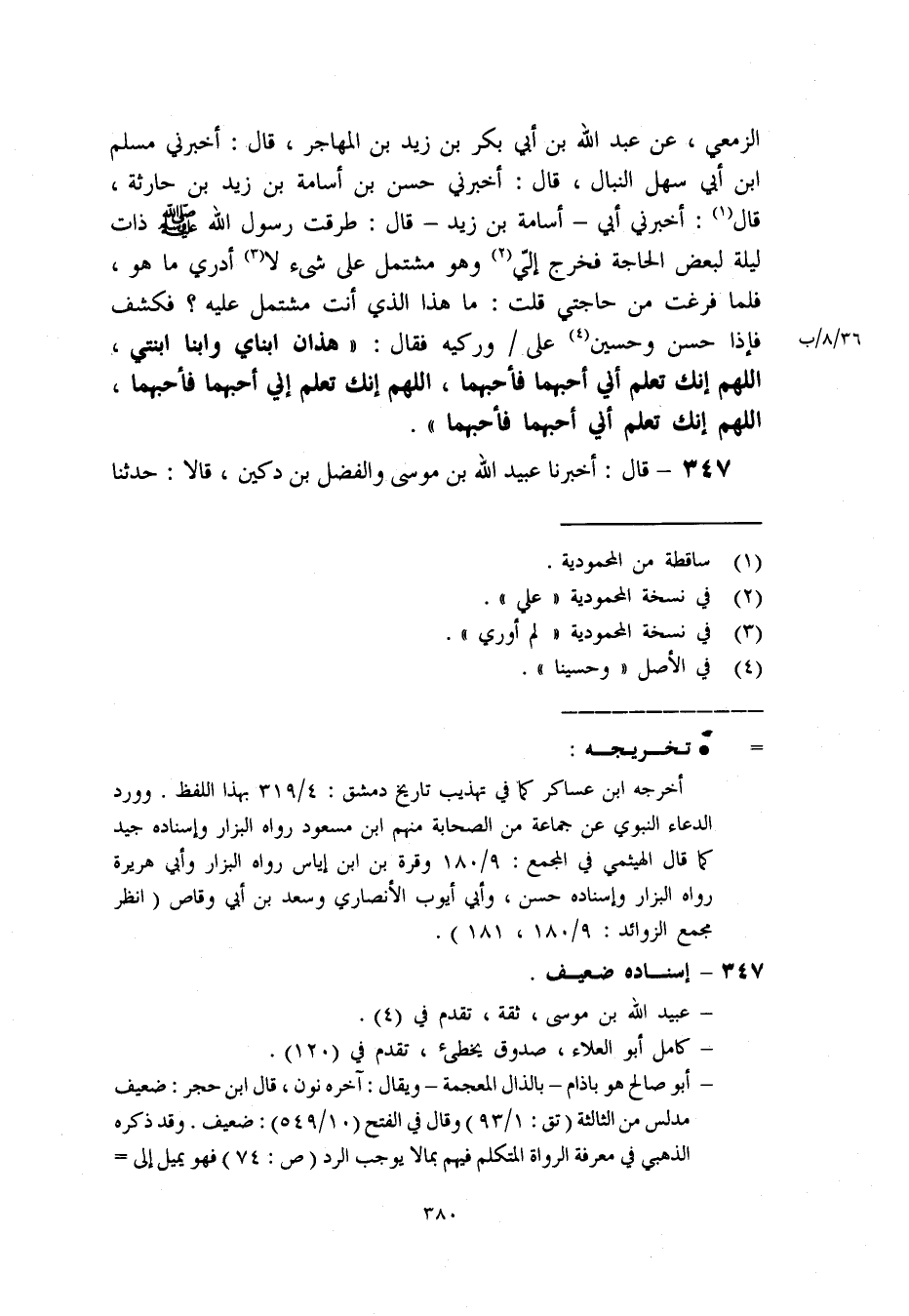 الزمعي. عن عبد الله بن أبي بكر بن زيد بن المهاجر. قال: أخبرني مسلم ابن أبي سهل النبال. قال: أخبرني حسن بن أسامة بن زيد بن حارثة.