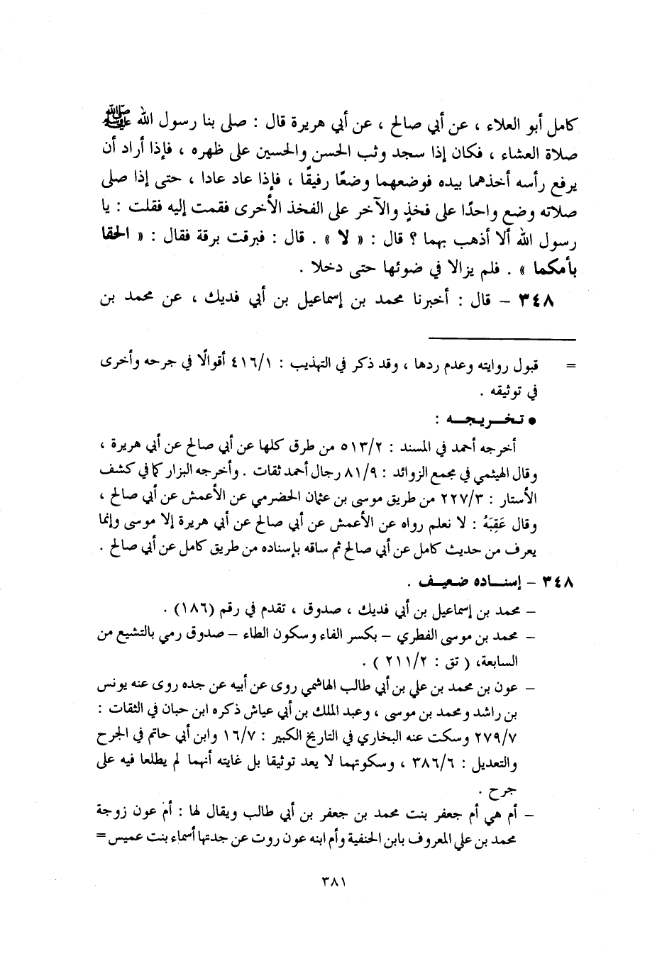 كامل أبو العلاء. عن أبي صالح. عن أبي هريرة قال: [صلى بنا رسول الله ص صلاة العشاء. فكان إذا سجد وثب الحسن والحسين على ظهره. فإذا أراد أن يرفع رأسه أخذهما بيده فوضعهما وضعا رفيقا. فإذا عاد عادا. حتى إذا صلى صلاته وضع واحدا على فخذ والآخر على الفخذ الأخرى فقمت إليه فقلت: يا رسول الله ألا أذهب بهما؟ قال:، لا،. قال: فبرقت برقة فقال:، الحقا بأمكما،. فلم يزالا في ضوئها حتى دخلا] .