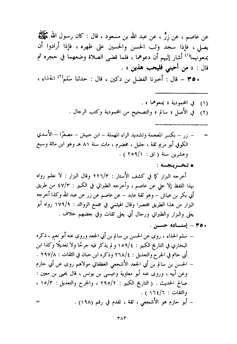 عن عاصم. عن زر. عن عبد الله بن مسعود. قال: كان رسول الله ص يصلي. فإذا سجد وثب الحسن والحسين على ظهره. فإذا أرادوا أن يمنعونهما «1» أشار إليهم أن دعوهما. فلما قضى الصلاة وضعهما في حجره ثم [قال:، من أحبني فليحب هذين] ،.